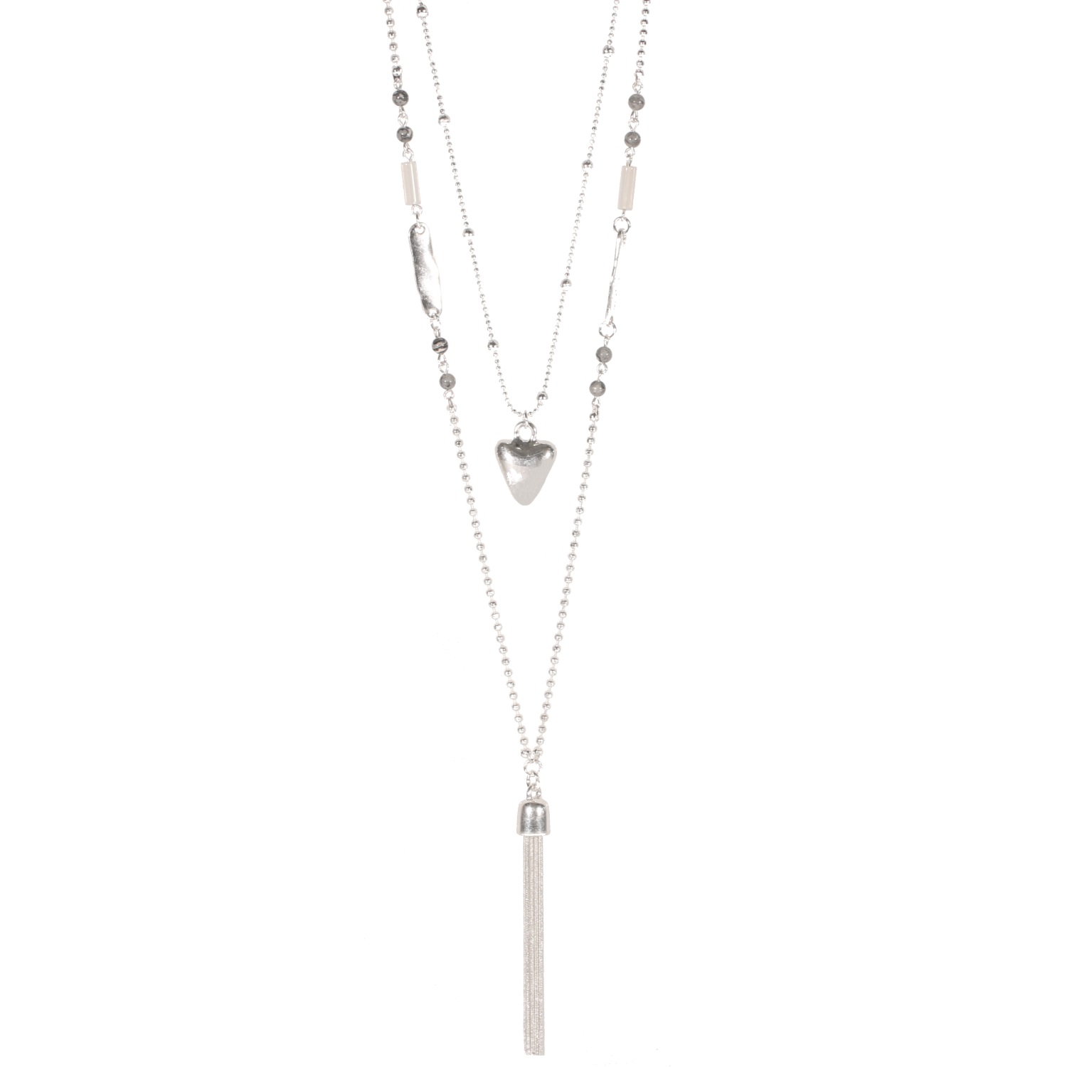 Collier sautoir fantaisie double rangs avec pendentif cœur et pompon et chaîne boules en métal argenté, pierres cylindriques transparentes, perles de couleur.