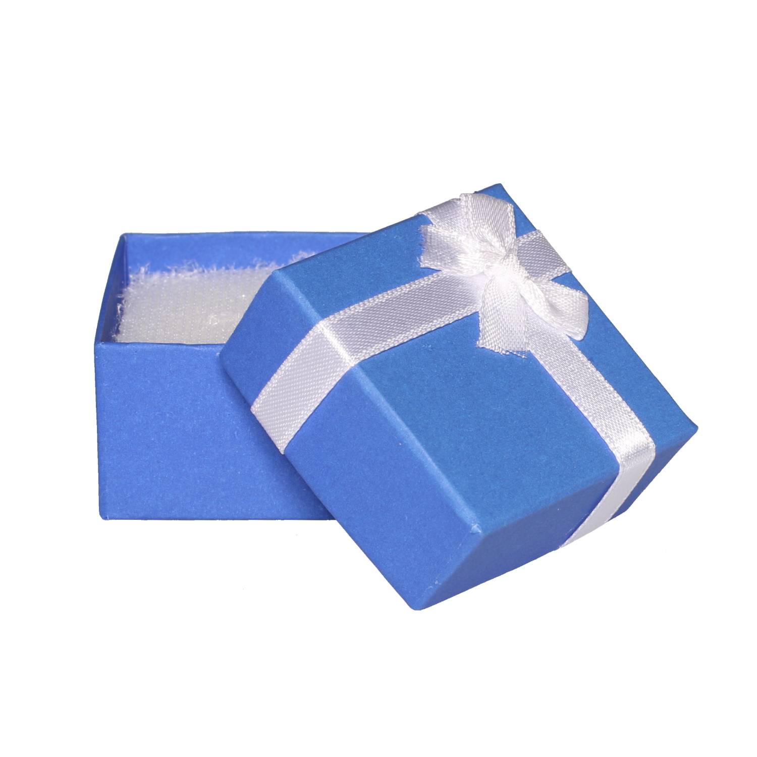 Ecrin boîte cadeau pour bague en carton de couleur bleu avec nœud en textile de couleur blanc.
