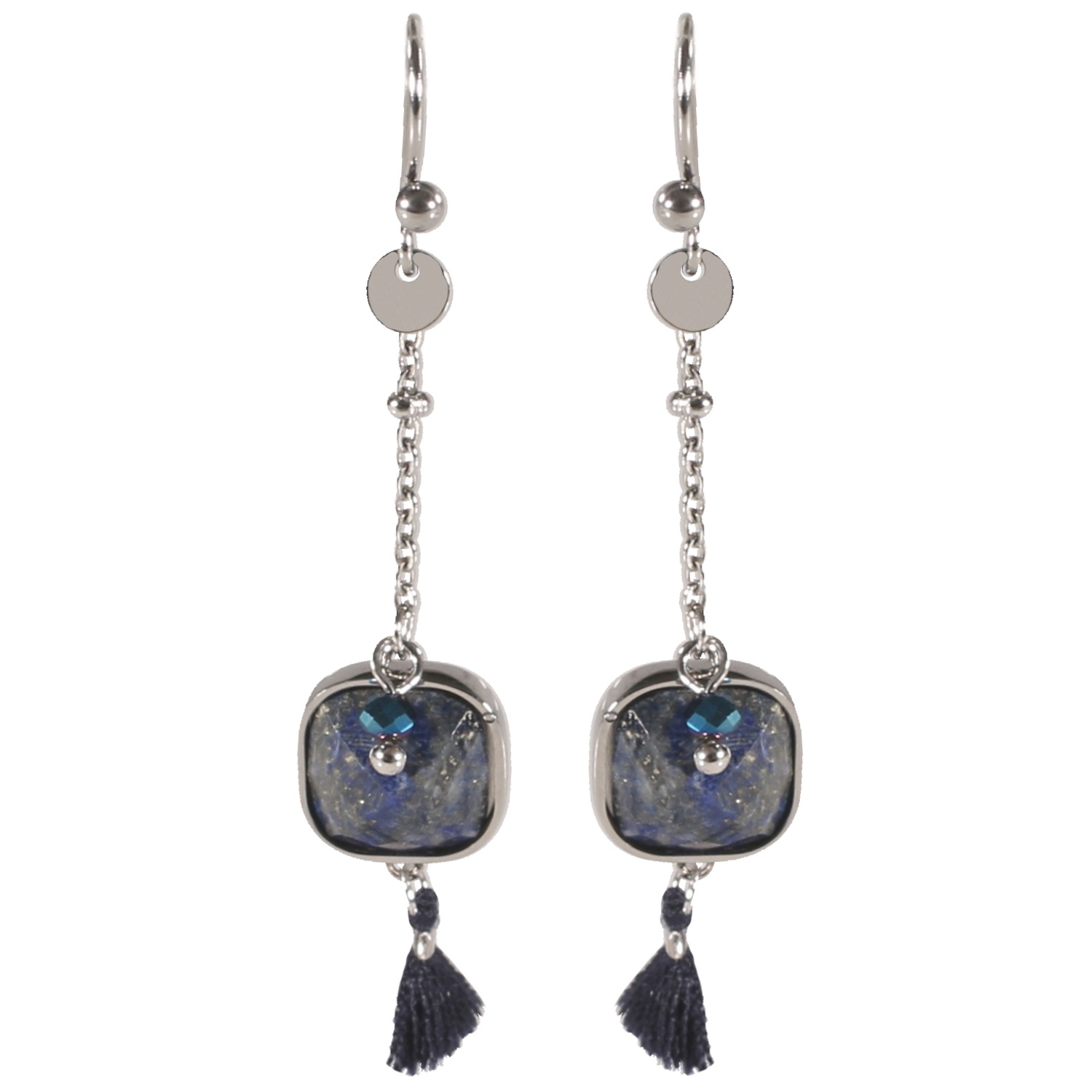Boucles d'oreilles pendantes en acier argenté, perles de couleur, véritables pierres de lapis lazuli serties clos de forme carré et finissant par un mini pompon en textile. Carré Pendantes Perle Pompon  Adolescent Adulte Automne Femme Fille Hiver
