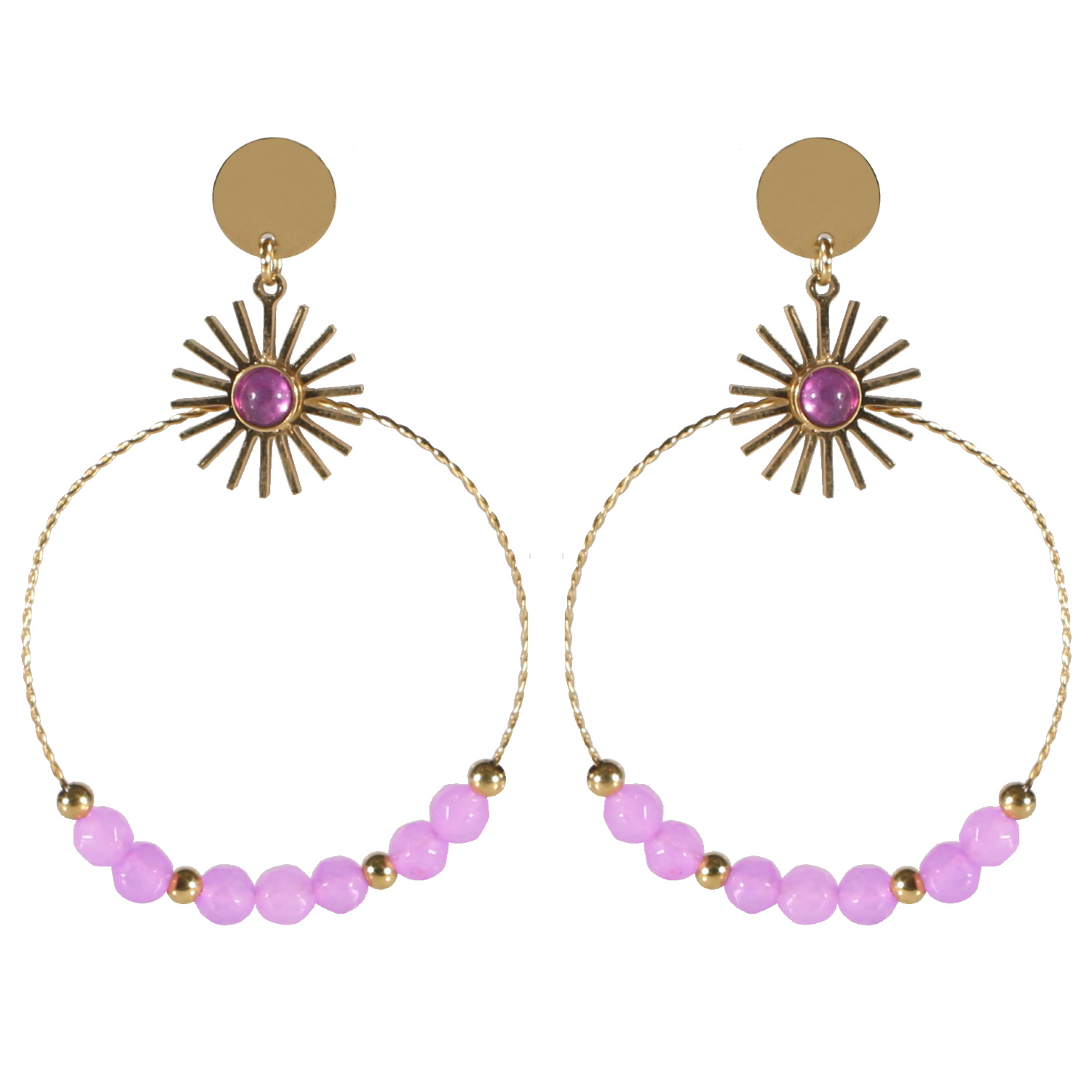 Boucles d'oreilles pendantes composées d'une pastille ronde lisse en acier doré, d'un soleil en acier doré serti d'une véritable pierre d'amethyste et d'un cercle en acier doré avec des perles en véritable pierre d'amethyste.