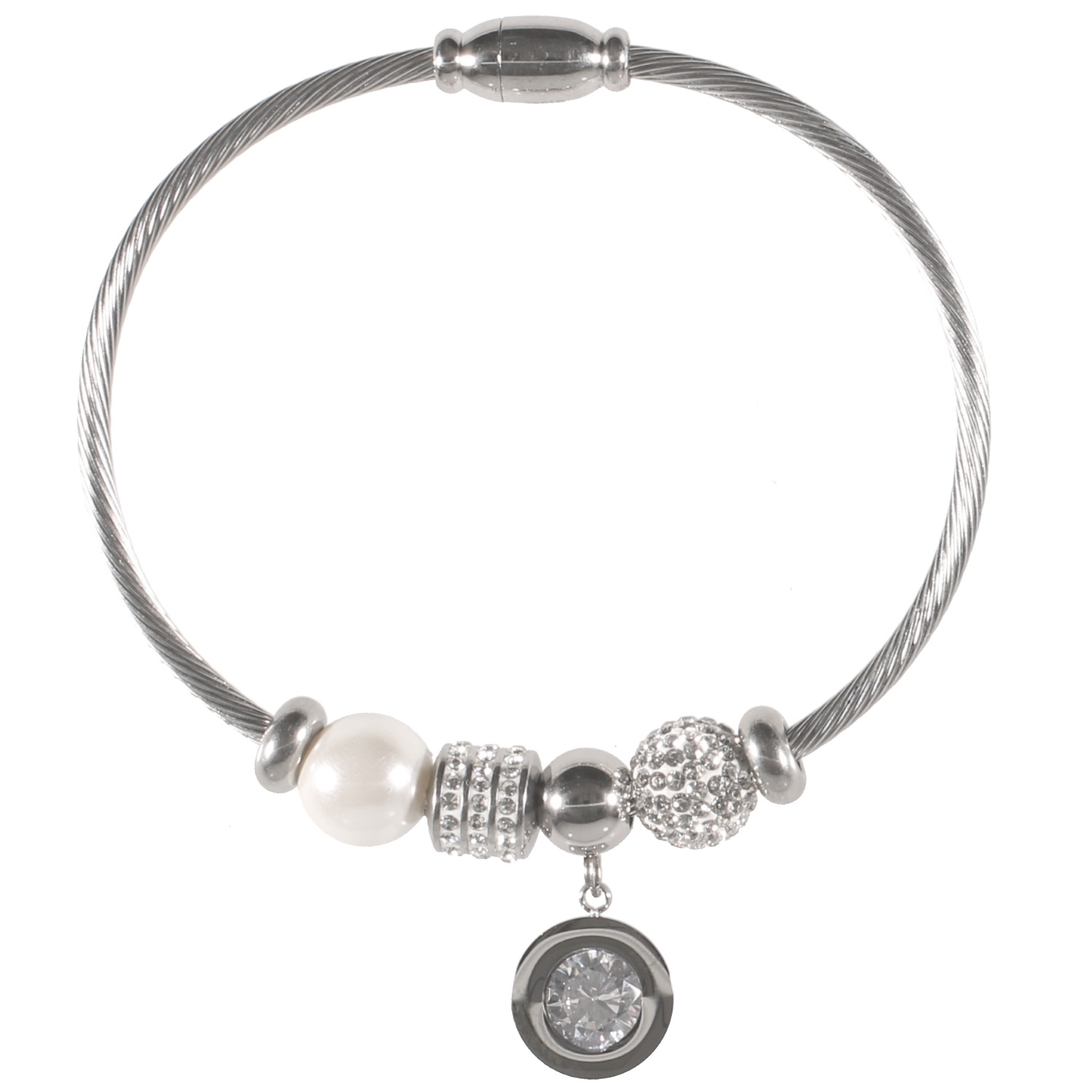 Bracelet charms avec breloques en acier argenté, perle synthétique, strass et cristal en verre.