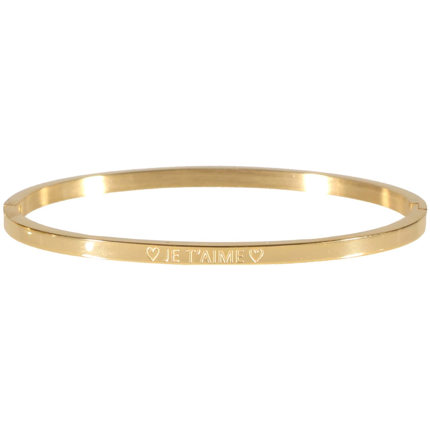 Description Bracelet jonc rigide pour les amoureux avec l'inscription Je t'aime encadrée de deux cœurs en acier doré. Cliquez sur une matière, un thème, une couleur ou une collection pour voir tous les articles associés.
