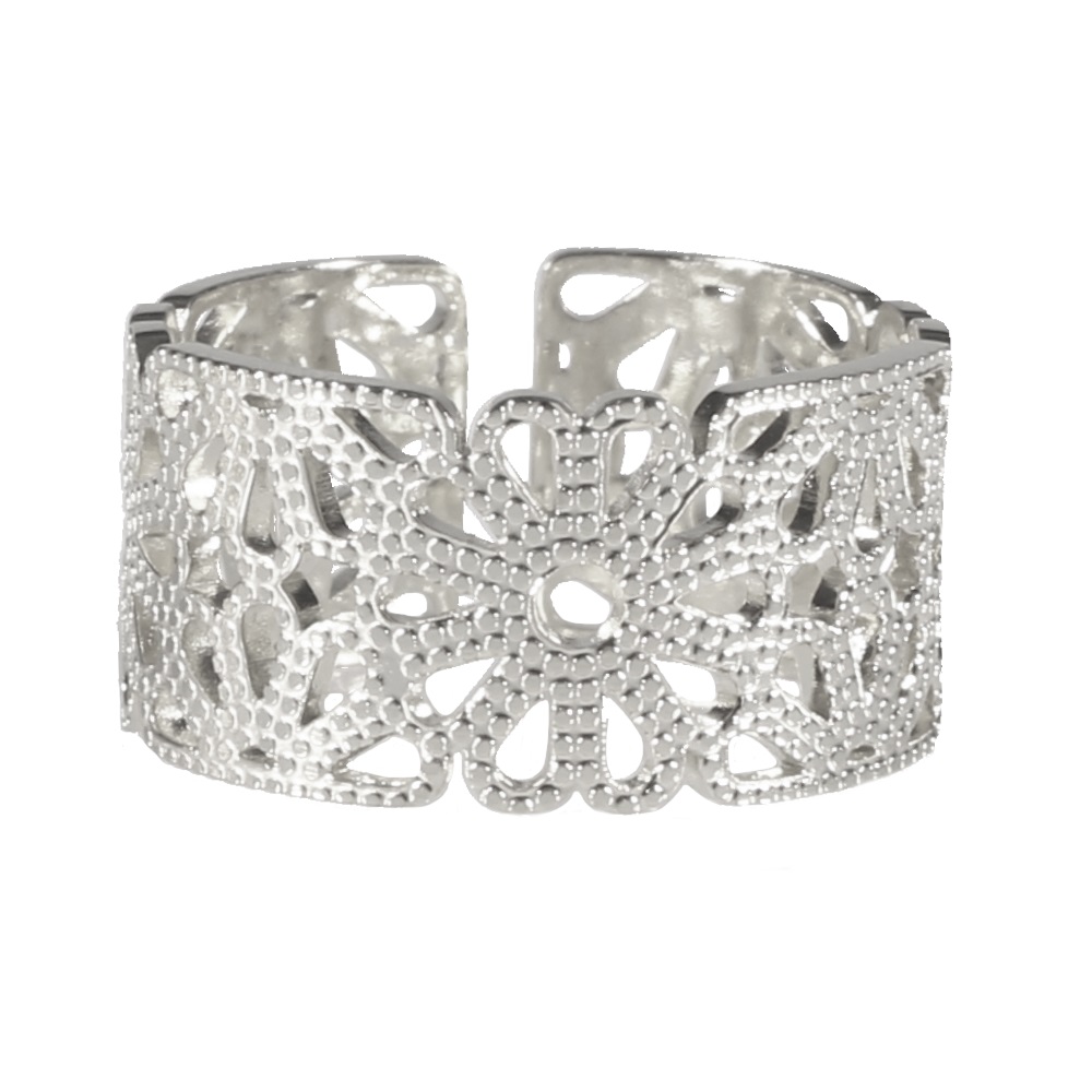 Description Bague dentelle ajourée motif fleur en acier 316L argenté. Largeur 10 mm Matière(s) Acier . L'acier utilisé dans la bijouterie existe sous plusieurs qualités. Nous utilisons principalement la qualité 316L, qualité qui est utilisée en chirurgie. Cet acier est donc inoxydable et reste très résistant. Fermoir Aucun À noter Taille ajustable Couleur(s) dominante(s) Argenté Public Adolescent , Adulte . Genre Femme , Fille . Saison Indémodable . Thème(s) Fleurs , Nature . Cliquez sur une matière, un thème, une couleur ou une collection pour voir tous les articles associés.