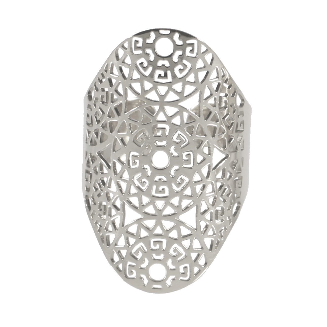 Description Bague de forme ovale avec motifs ajourés en acier argenté. Taille ajustable. Largeur 20 mm Hauteur 30 mm Matière(s) Acier . L'acier utilisé dans la bijouterie existe sous plusieurs qualités. Nous utilisons principalement la qualité 316L, qualité qui est utilisée en chirurgie. Cet acier est donc inoxydable et reste très résistant. Fermoir Aucun À noter Taille ajustable Couleur(s) dominante(s) Argenté Public Adolescent , Adulte . Genre Femme , Fille . Saison Indémodable . Cliquez sur une matière, un thème, une couleur ou une collection pour voir tous les articles associés.