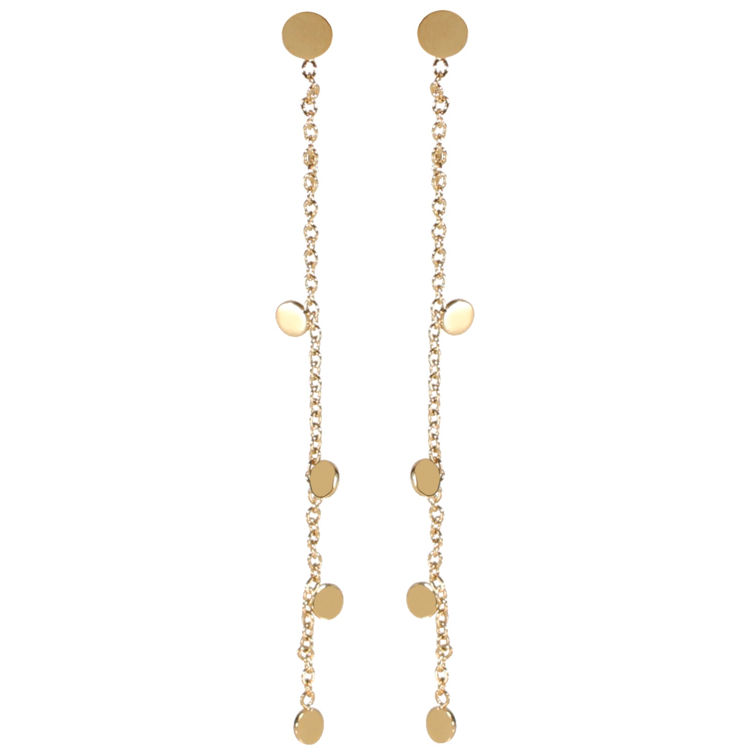 Description Boucles d'oreilles pendantes composées d'une chaîne et de pampilles rondes en acier doré. Largeur 4 mm Hauteur 52 mm Matière(s) Acier . L'acier utilisé dans la bijouterie existe sous plusieurs qualités. Nous utilisons principalement la qualité 316L, qualité qui est utilisée en chirurgie. Cet acier est donc inoxydable et reste très résistant. Fermoir Tiges poussettes Couleur(s) dominante(s) Doré Public Adolescent , Adulte . Genre Femme , Fille . Saison Indémodable . Collection La petite Parisienne Cliquez sur une matière, un thème, une couleur ou une collection pour voir tous les articles associés.