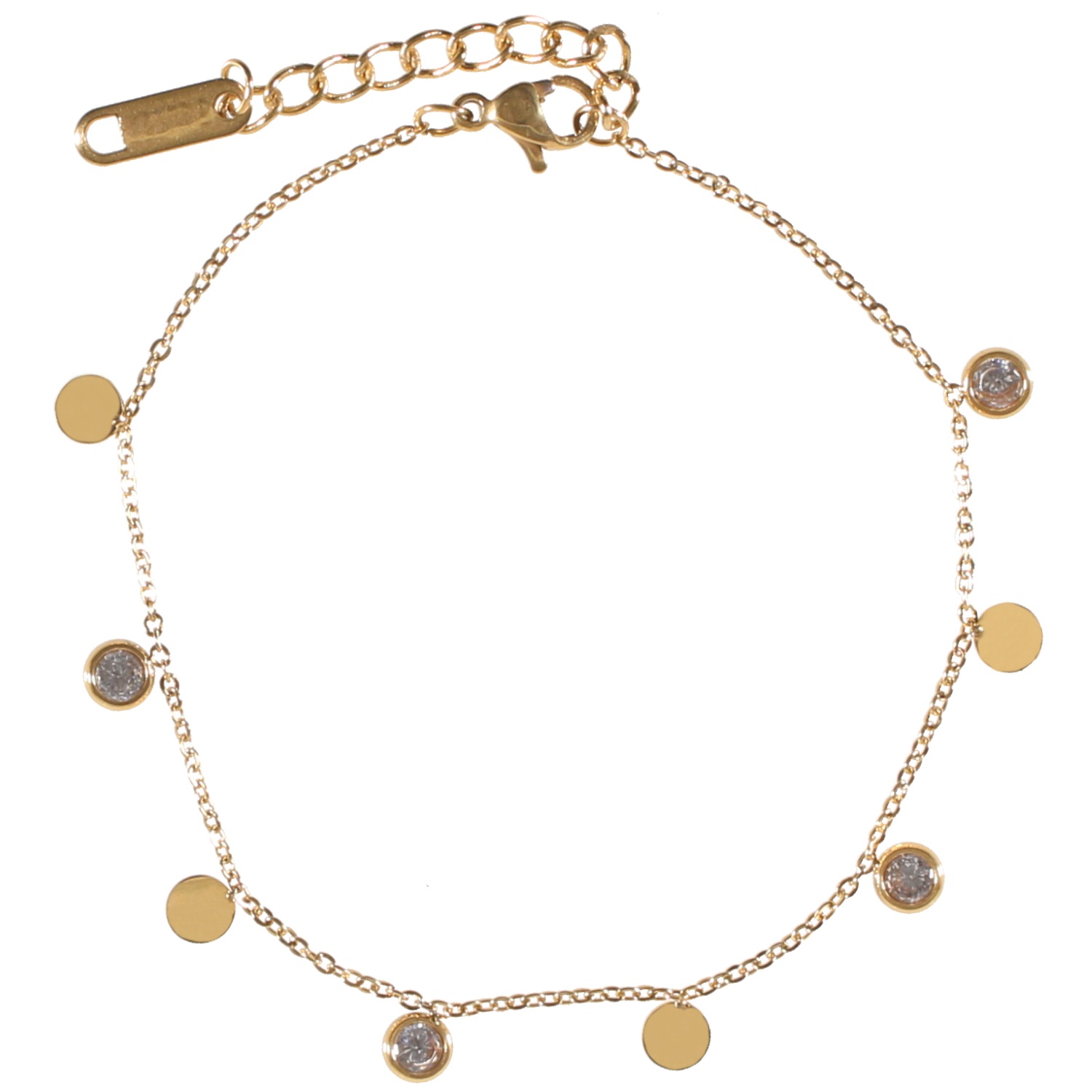 Description Bracelet composé d'une chaîne et pampilles rondes en acier doré et pampilles avec cristaux sertis clos. Fermoir mousqueton avec 2.5 cm de rallonge. Cliquez sur une matière, un thème, une couleur ou une collection pour voir tous les articles associés.