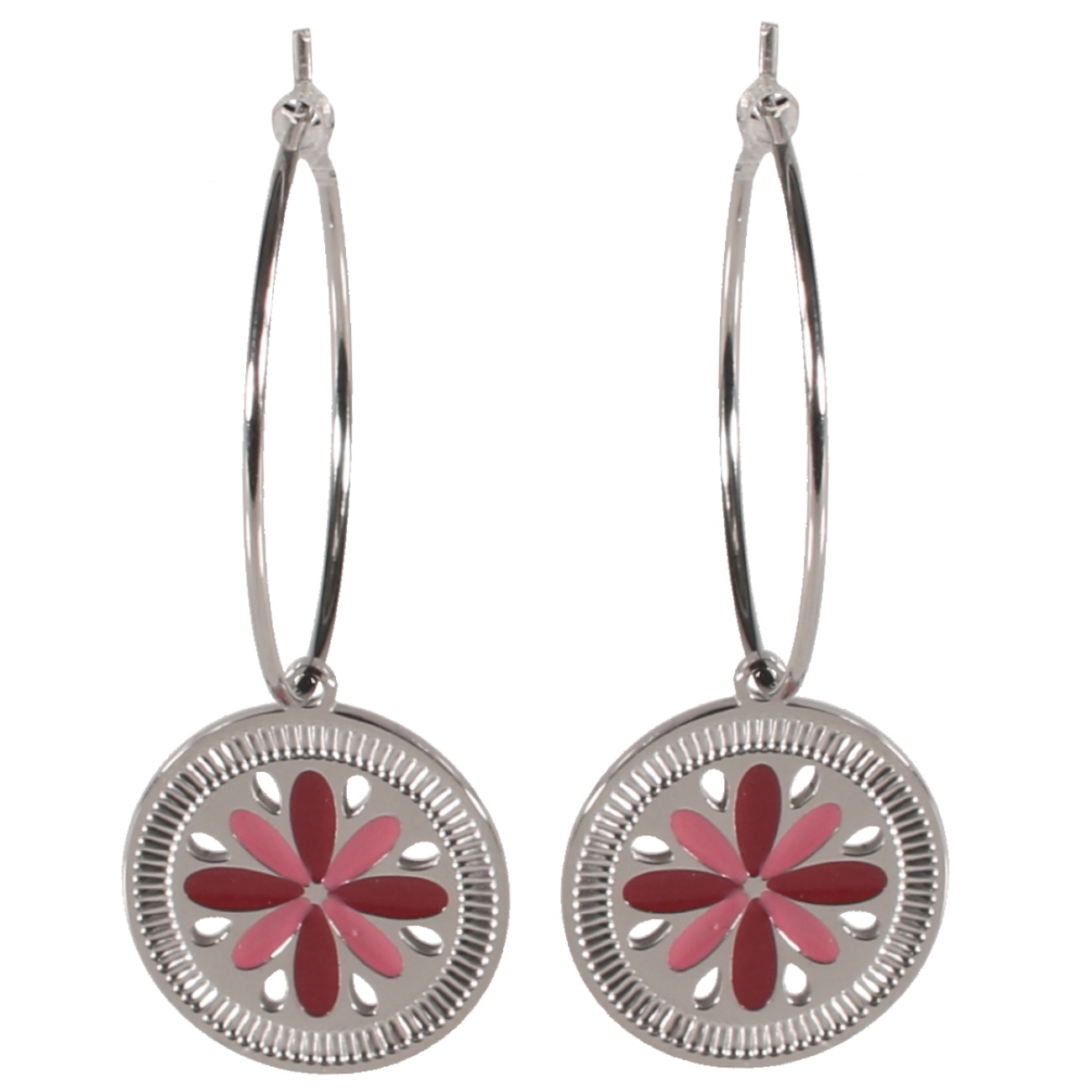 Description Boucles d'oreilles créoles avec pastille ronde pendante en acier argenté au motif de fleurs en émail de couleur. Largeur 14 mm Hauteur 35 mm Diamètre 20 mm Matière(s) Acier , Email . L'acier utilisé dans la bijouterie existe sous plusieurs qualités. Nous utilisons principalement la qualité 316L, qualité qui est utilisée en chirurgie. Cet acier est donc inoxydable et reste très résistant. Fermoir Autre Couleur(s) dominante(s) Argenté , Rose Public Adolescent , Adulte . Genre Femme , Fille . Saison Indémodable . Thème(s) Fleurs , Nature . Cliquez sur une matière, un thème, une couleur ou une collection pour voir tous les articles associés.