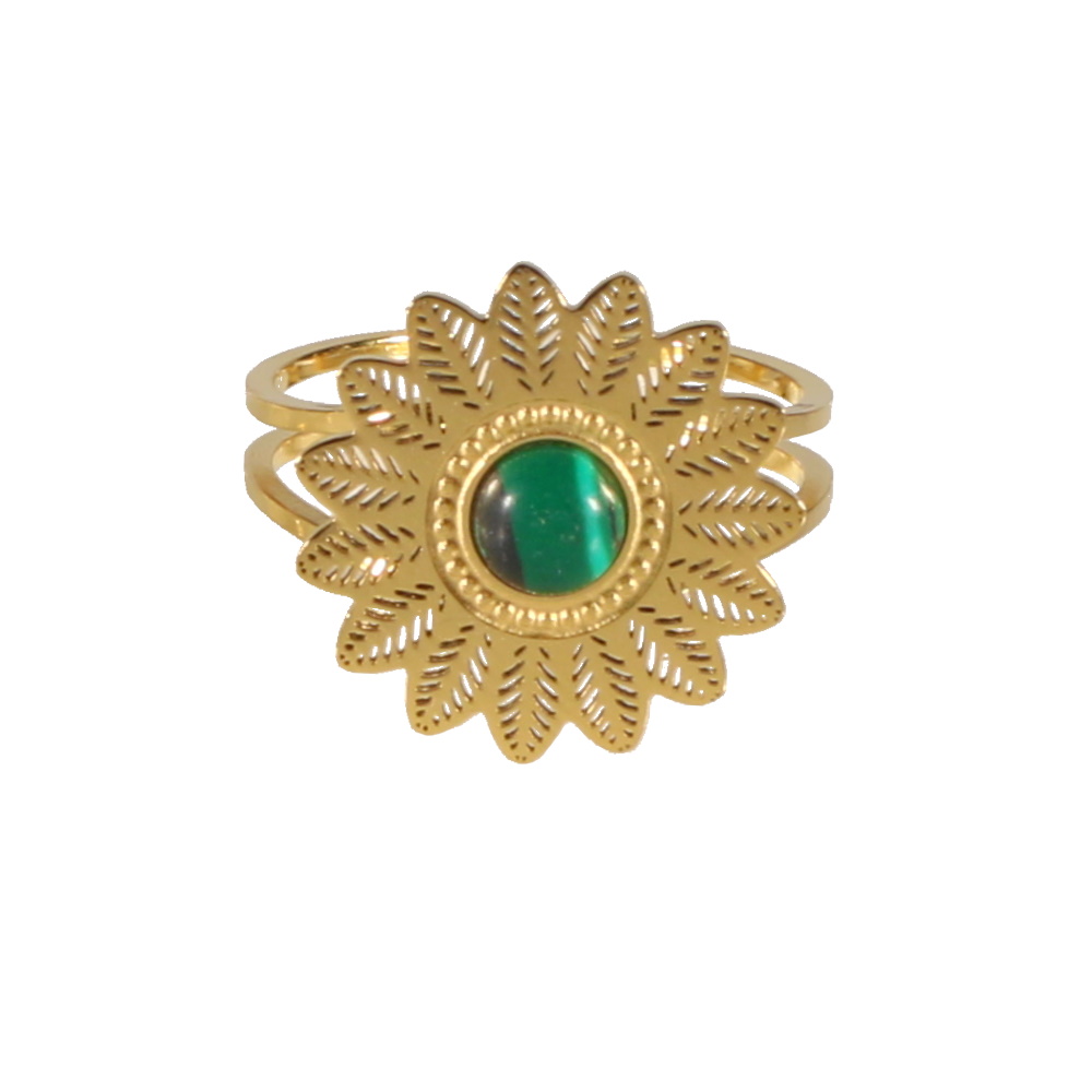 Description Bague en forme de fleur en acier doré surmontée d'une pierre d'imitation malachite. Taille ajustable. Largeur 17 mm Matière(s) Acier , Rocaille . L'acier utilisé dans la bijouterie existe sous plusieurs qualités. Nous utilisons principalement la qualité 316L, qualité qui est utilisée en chirurgie. Cet acier est donc inoxydable et reste très résistant. Fermoir Aucun Couleur(s) dominante(s) Doré , Vert Public Adolescent , Adulte . Genre Femme , Fille . Saison Indémodable . Thème(s) Fleurs , Nature . Cliquez sur une matière, un thème, une couleur ou une collection pour voir tous les articles associés.