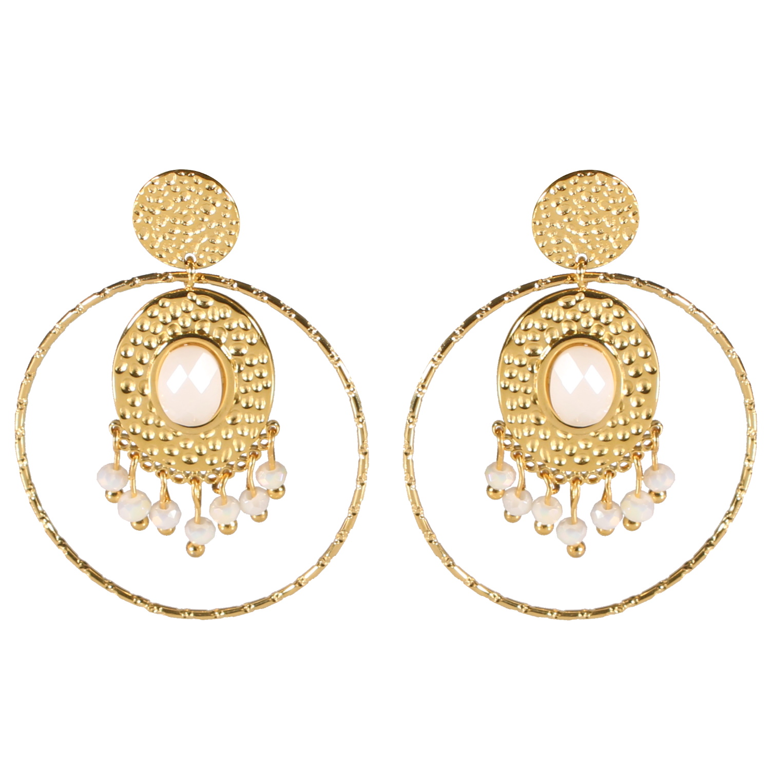 Description Boucles d'oreilles pendantes composées d'une pastille ronde martelée et d'un cercle en acier doré, d'une pastille ovale martelée en acier doré surmontée d'une pierre de couleur blanche, et des pampilles de perles de couleur blanche. Largeur 35 mm Hauteur 44 mm Matière(s) Acier , Rocaille . L'acier utilisé dans la bijouterie existe sous plusieurs qualités. Nous utilisons principalement la qualité 316L, qualité qui est utilisée en chirurgie. Cet acier est donc inoxydable et reste très résistant. Fermoir Tiges poussettes Couleur(s) dominante(s) Blanc , Doré Public Adolescent , Adulte . Genre Femme , Fille . Saison Indémodable . Cliquez sur une matière, un thème, une couleur ou une collection pour voir tous les articles associés.