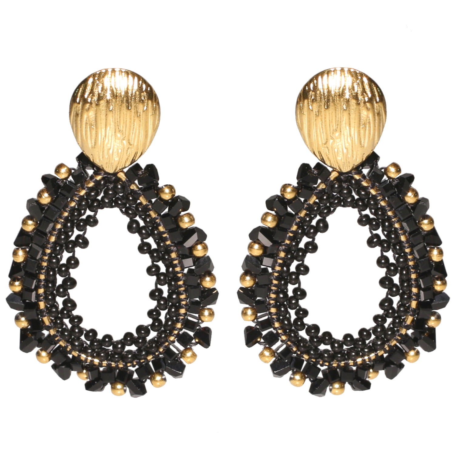Boucles d'oreilles pendantes composées d'une puce ovale en acier doré et d'un cercle ovale surmonté de perles en acier doré et de perles de couleur noire.