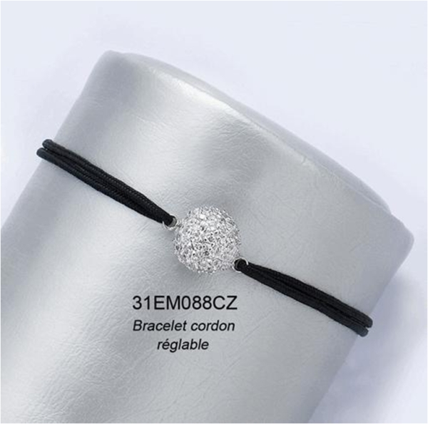 Bracelet en argent 925/000 rhodié, oxyde de zirconium et coton.
