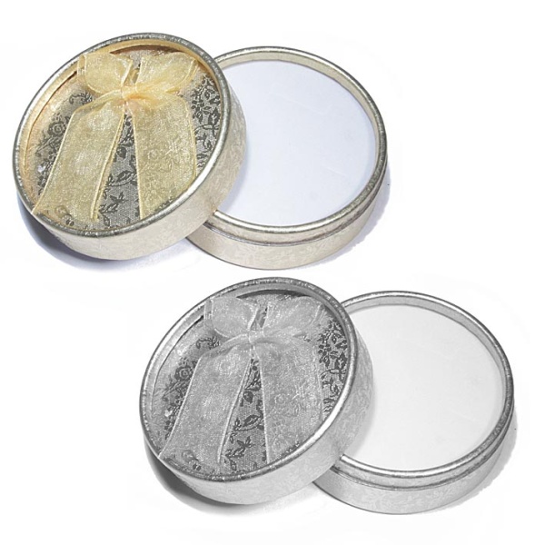 Boîte cadeau en carton motif fleurs et noeud en textile.