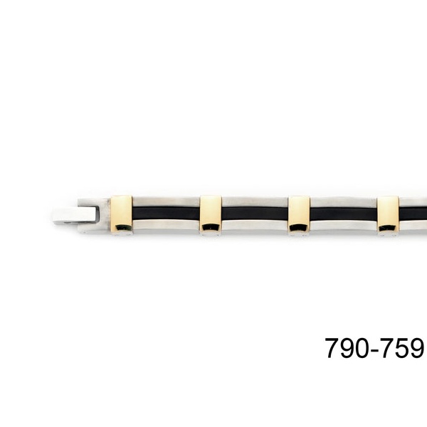 Bracelet en acier, plaqué-or, caoutchouc noir et inox.