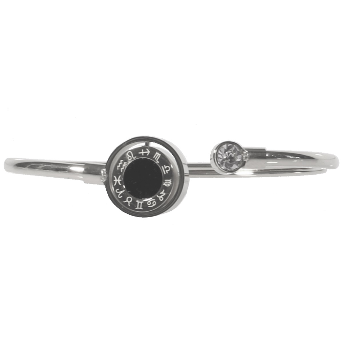 Bracelet jonc rigide en acier argenté, pierre d'imitation onyx, nacre et cristal synthétique.