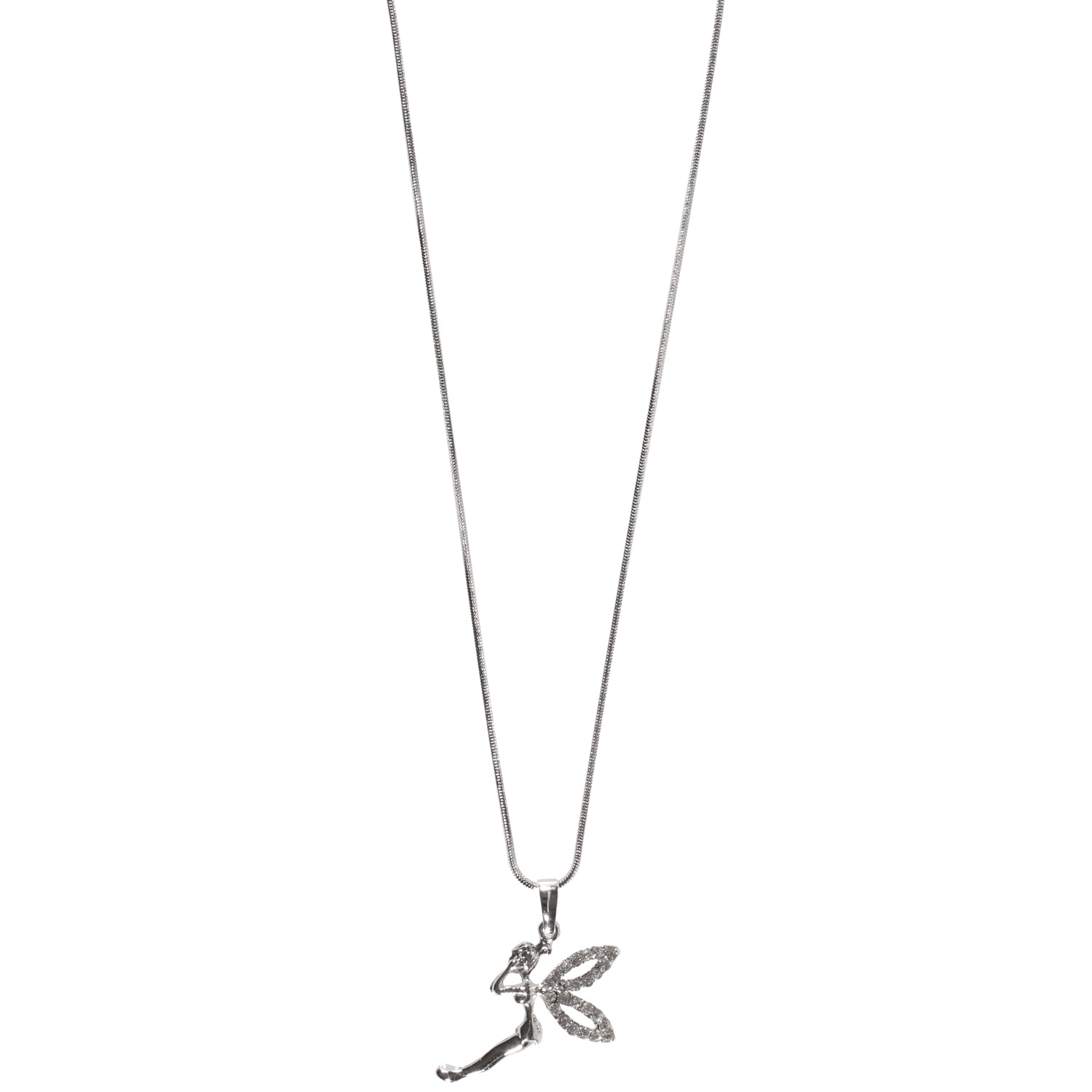 Collier fantaisie avec pendentif fée en métal argenté et strass couleur cristal.