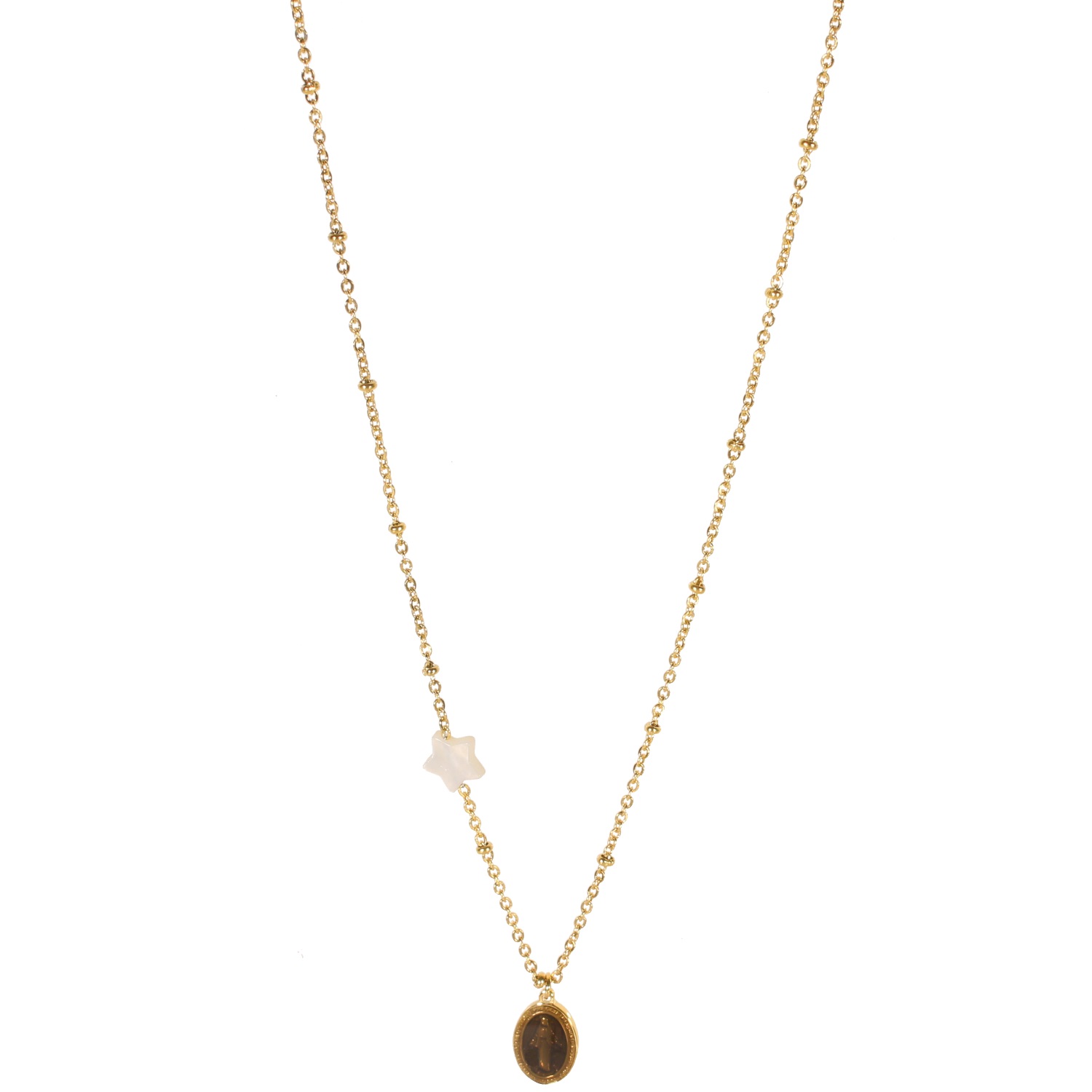 Collier avec vierge en acier doré et verre et étoile en nacre.