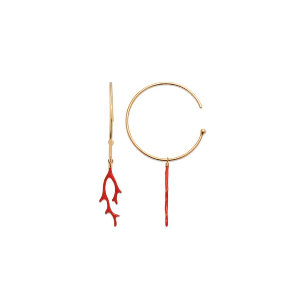 Corail en émail de couleur rouge monté sur des boucles d'oreilles créoles en plaqué or 18 carats.