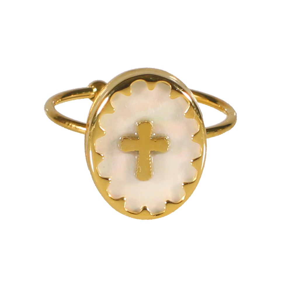 Bague surmontée d'une pastille ovale sertie de nacre avec une croix en acier doré.