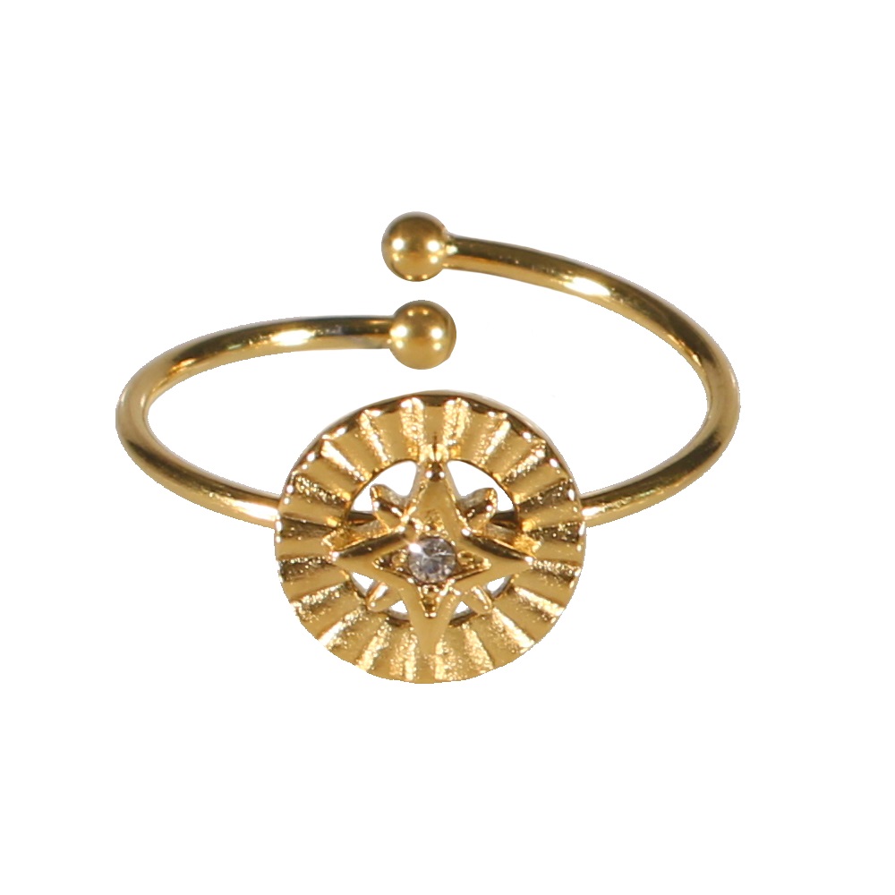 Description Bague surmontée d'une étoile sur une pastille ronde en acier doré sertie d'un cristal. Taille ajustable. Largeur 10 mm Matière(s) Acier , Verre . L'acier utilisé dans la bijouterie existe sous plusieurs qualités. Nous utilisons principalement la qualité 316L, qualité qui est utilisée en chirurgie. Cet acier est donc inoxydable et reste très résistant. Couleur(s) dominante(s) Doré Public Adolescent , Adulte . Genre Femme , Fille . Saison Indémodable . Thème(s) Nature . Cliquez sur une matière, un thème, une couleur ou une collection pour voir tous les articles associés.