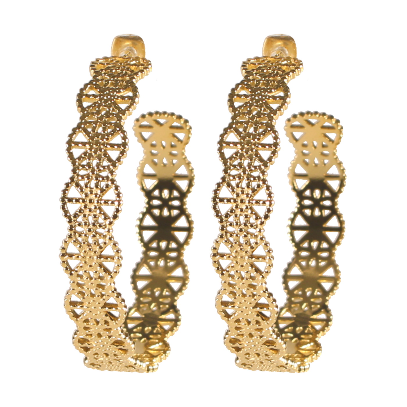 Description Boucles d'oreilles créoles ouvertes aux motifs ajourés en acier doré. Largeur 8 mm Diamètre 40 mm [Guide des tailles] Matière(s) Acier . L'acier utilisé dans la bijouterie existe sous plusieurs qualités. Nous utilisons principalement la qualité 316L, qualité qui est utilisée en chirurgie. Cet acier est donc inoxydable et reste très résistant. Fermoir Tiges poussettes Couleur(s) dominante(s) Doré Public Adolescent , Adulte . Genre Femme , Fille . Saison Indémodable . Cliquez sur une matière, un thème, une couleur ou une collection pour voir tous les articles associés.