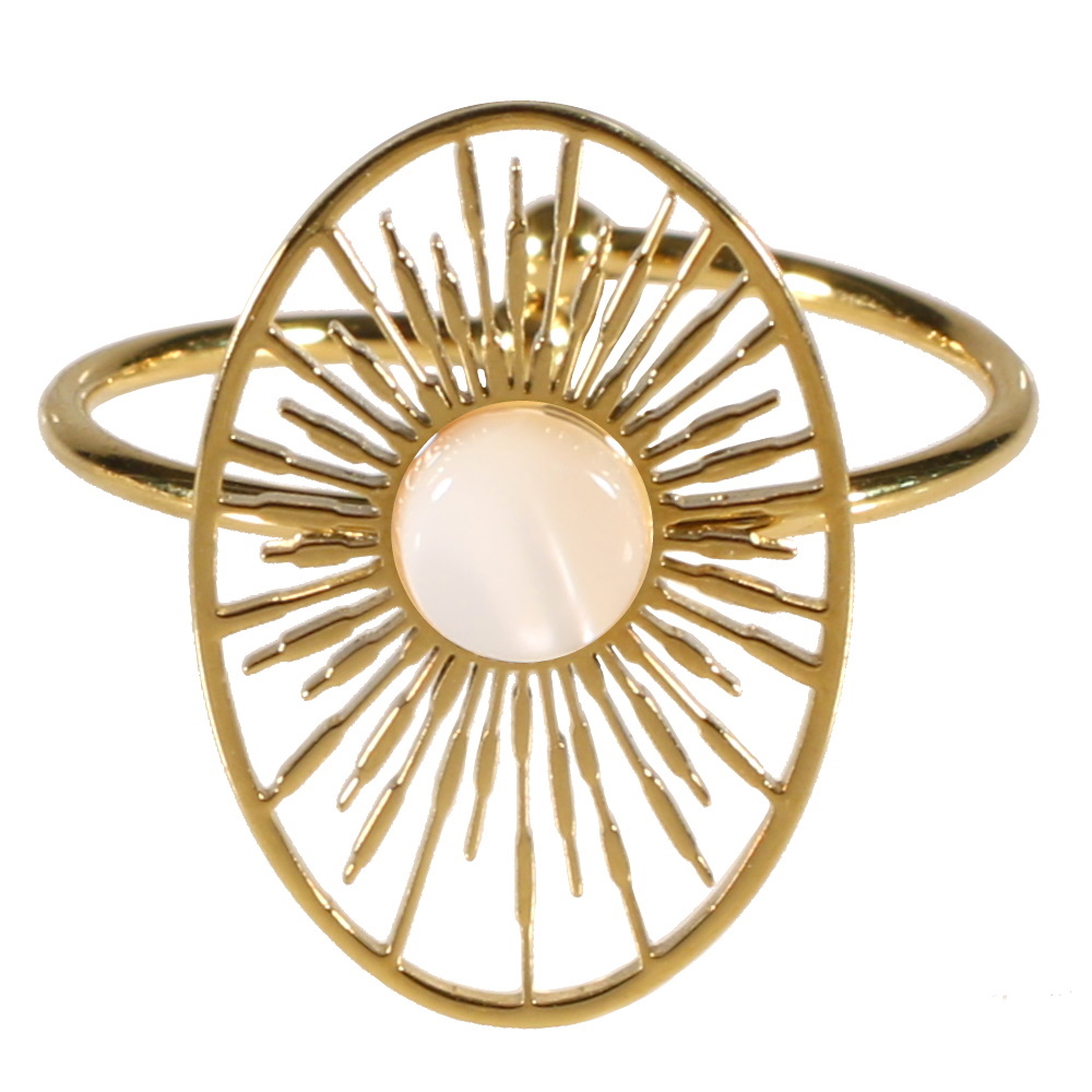 Bague avec rayons de soleil dans un cercle ovale en acier doré surmontée d'une nacre de forme ronde.