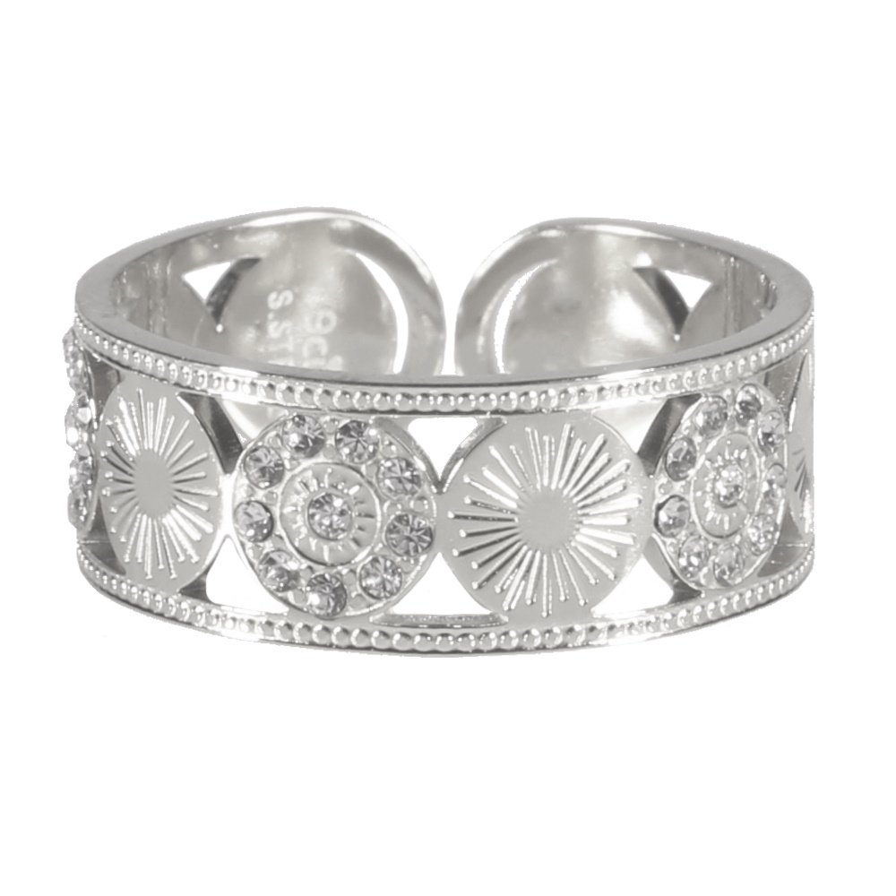 Description Bague composée de pastilles rondes avec motifs de rayons de soleil en acier 316L argenté et certaines pavées de strass en verre. Taille ajustable. Largeur 7 mm Matière(s) Acier , Verre . L'acier utilisé dans la bijouterie existe sous plusieurs qualités. Nous utilisons principalement la qualité 316L, qualité qui est utilisée en chirurgie. Cet acier est donc inoxydable et reste très résistant. Fermoir Aucun Couleur(s) dominante(s) Argenté Public Adolescent , Adulte . Genre Femme , Fille . Saison Indémodable . Cliquez sur une matière, un thème, une couleur ou une collection pour voir tous les articles associés.
