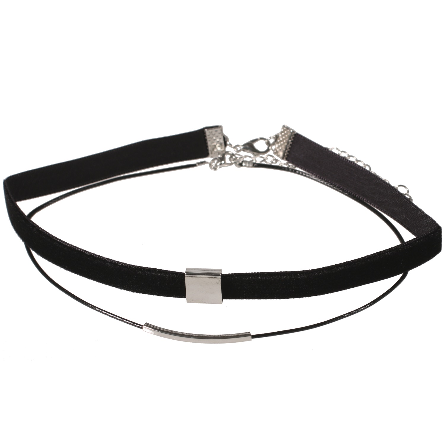 Lot de 2 colliers ras de cou fantaisie en métal argenté, coton et velours.
