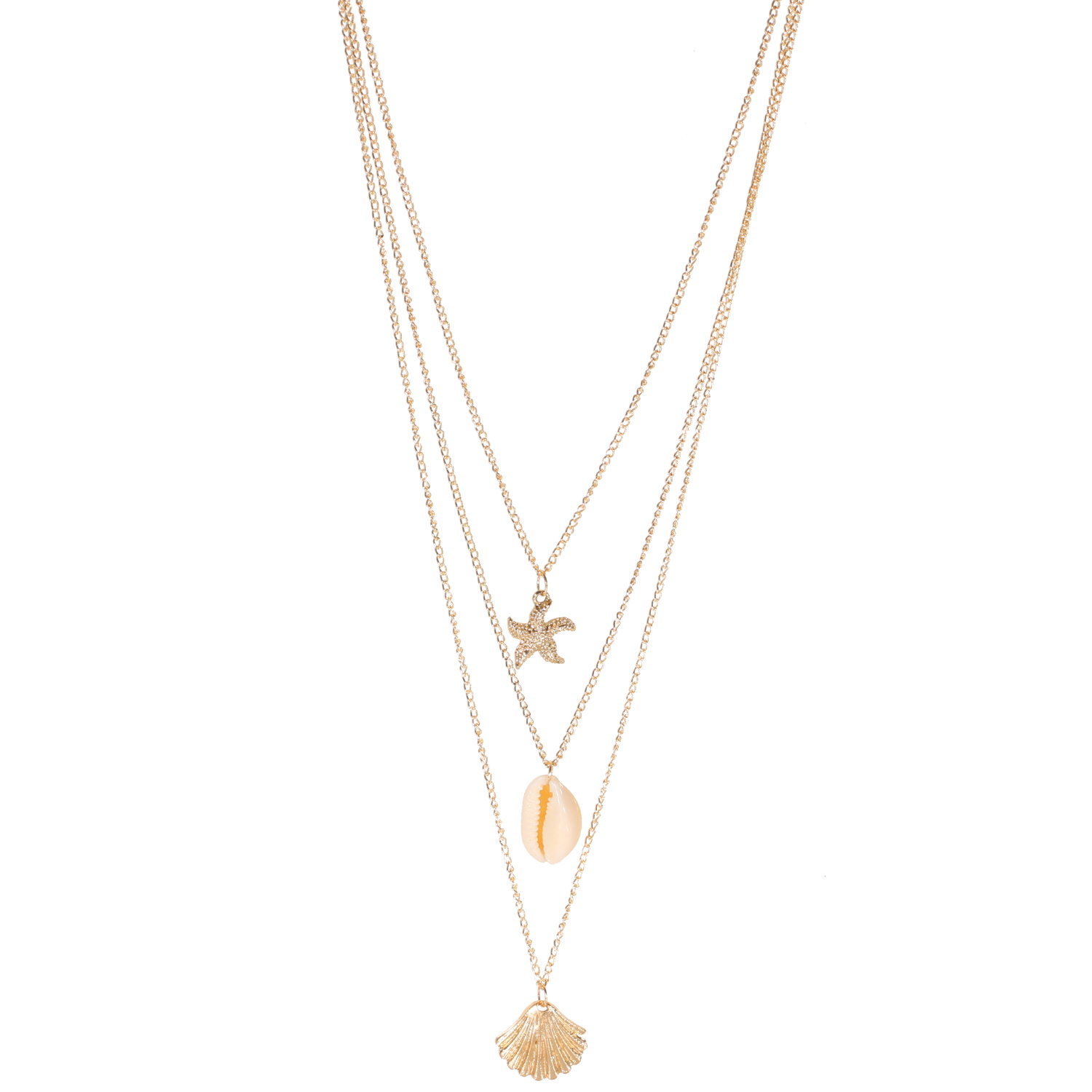 Collier sautoir triple rangs composé d'une chaîne de 44 cm de long avec pendentif étoile de mer en métal doré, une chaîne de 50 cm de long en métal doré avec pendentif coquillage cauri, ainsi qu'une chaîne de 60 cm de long avec pendentif coquillage en métal doré.