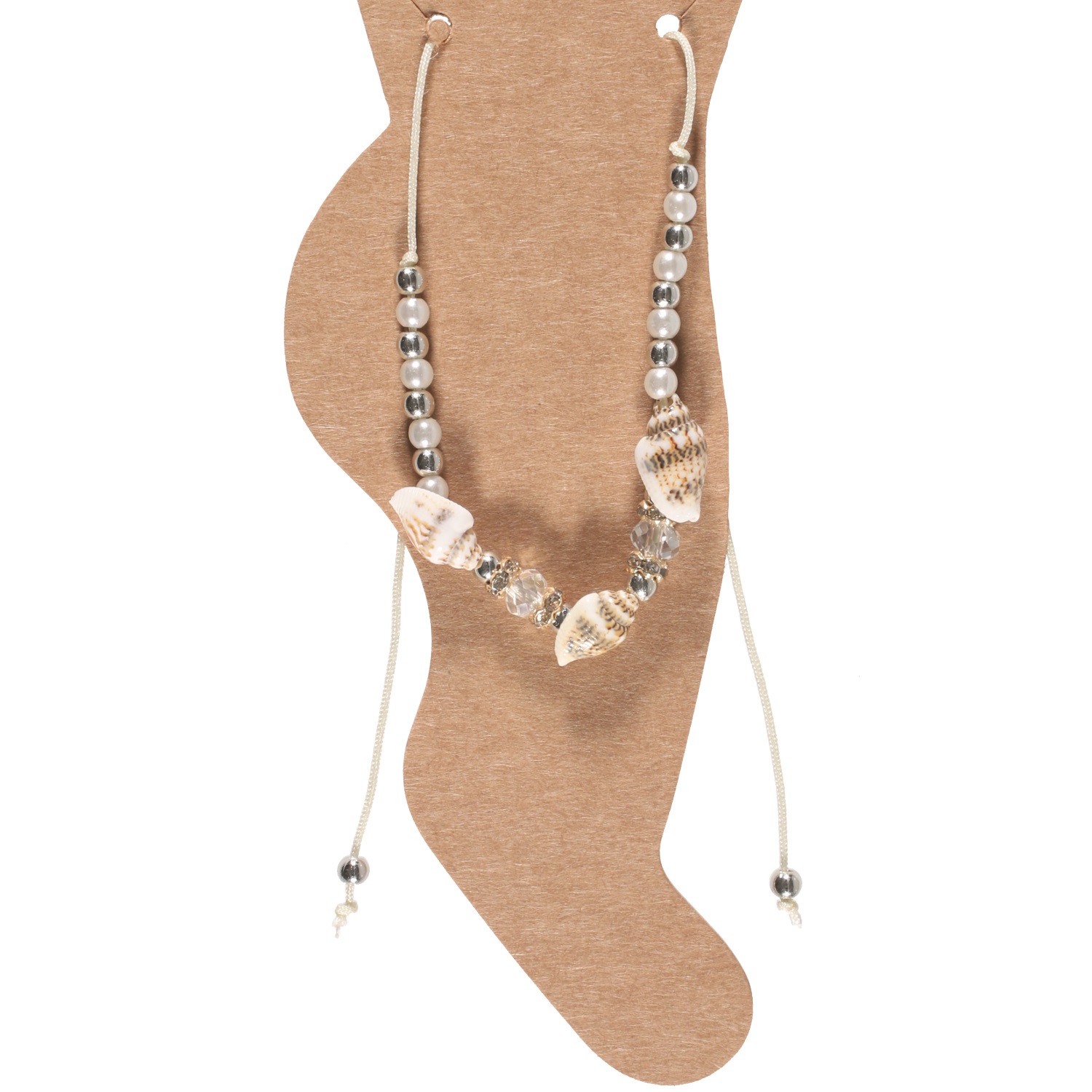 Bracelet de cheville fantaisie avec cordon en textile, perles en métal argenté, perles en nacre, cristaux et coquillages.