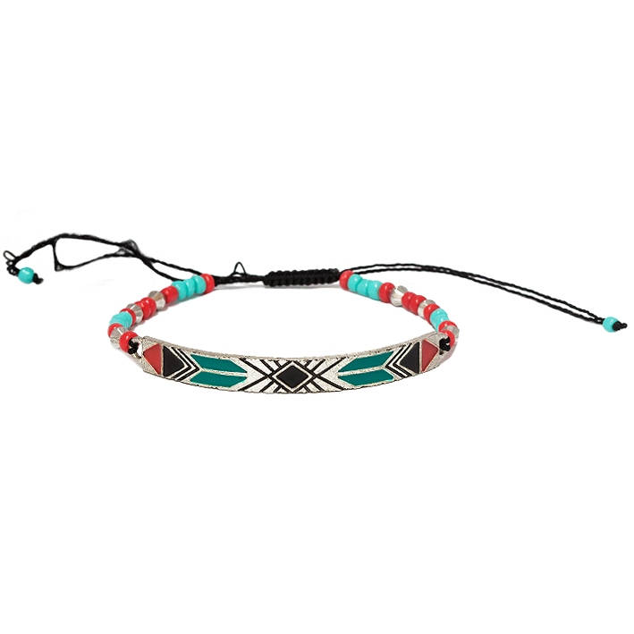 Bracelet fantaisie en métal argenté vieilli, émail, textile et rocaille.