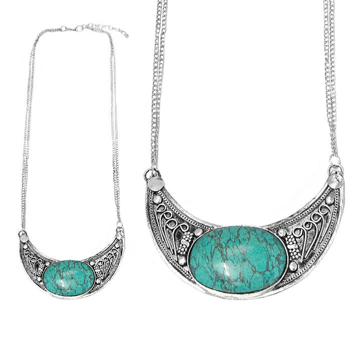 Collier fantaisie en métal argenté vieilli et pierres naturelles.