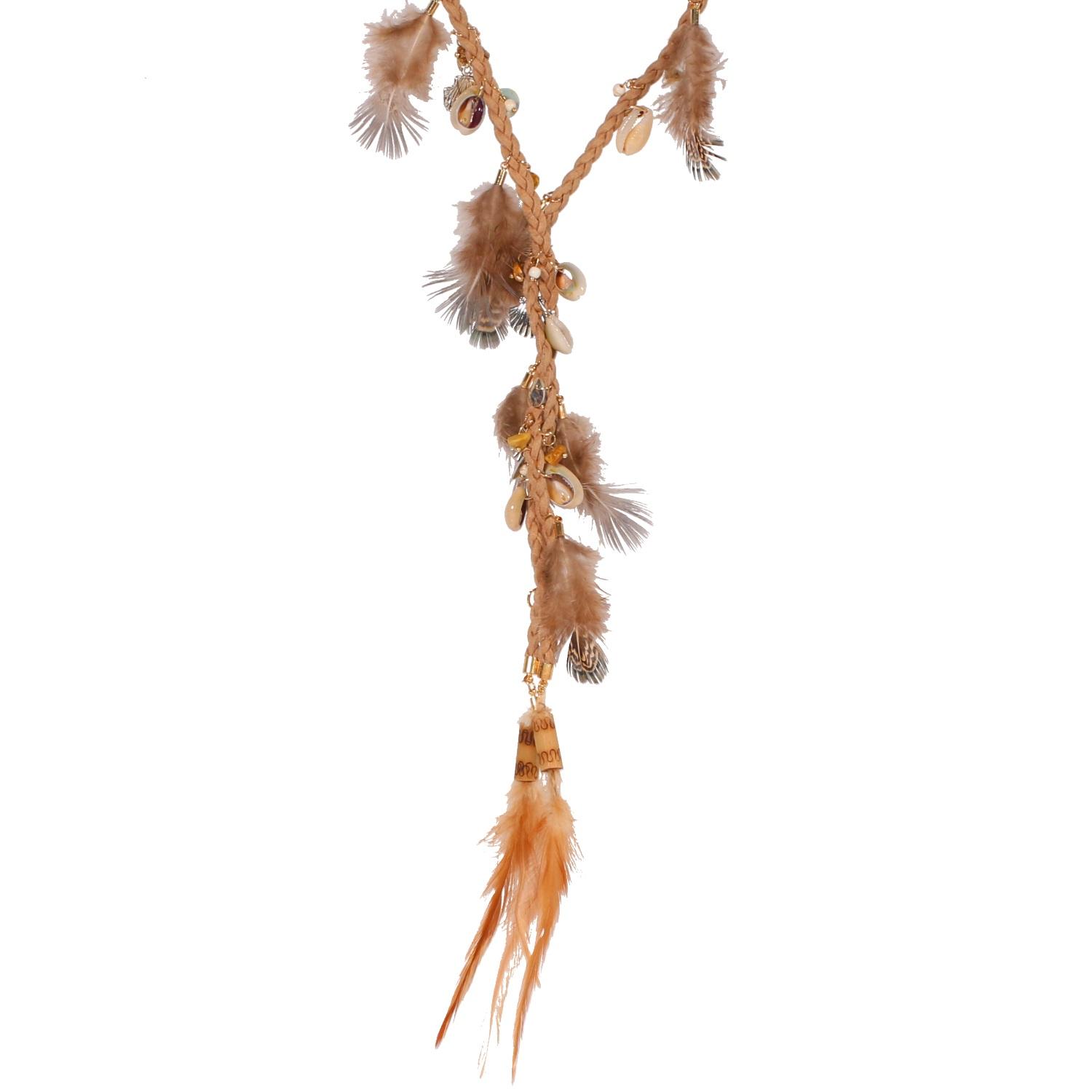 Collier sautoir en suédine, métal, rocaille, coquillage et plume.
