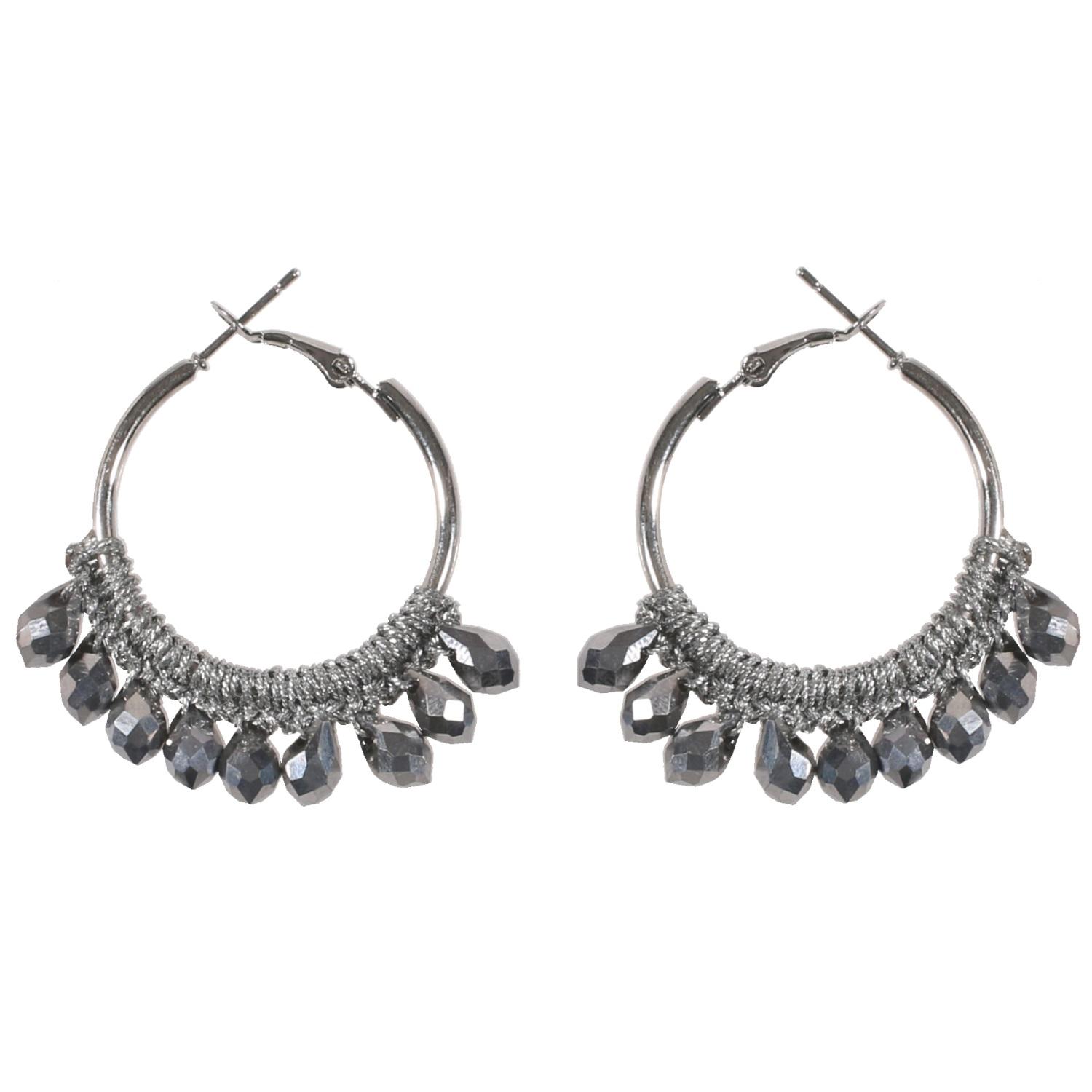 Boucles d'oreilles créoles fantaisie en métal argenté, rocaille et textile.