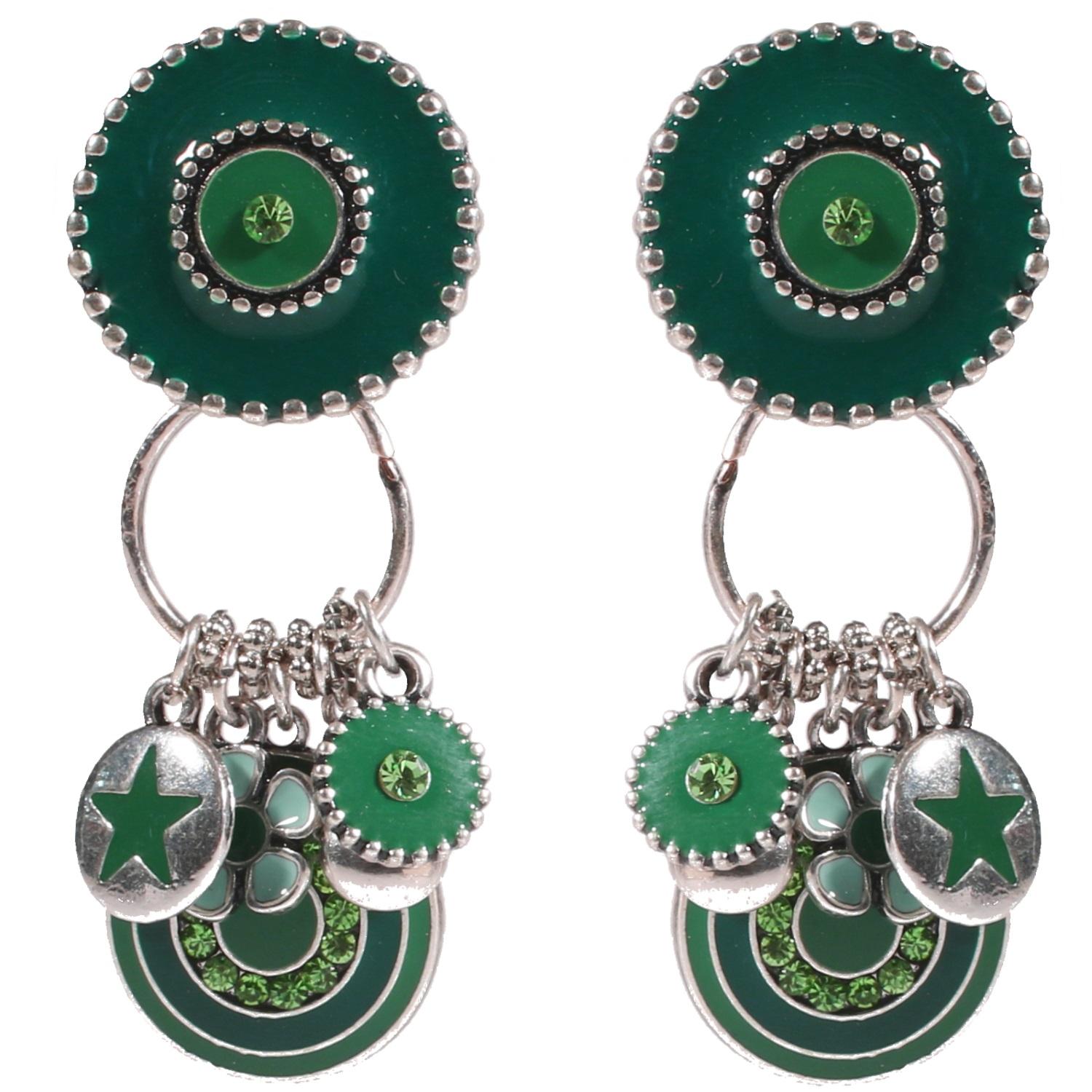 Boucles d'oreilles fantaisie en métal argenté, métal peint et cristaux synthétiques.
