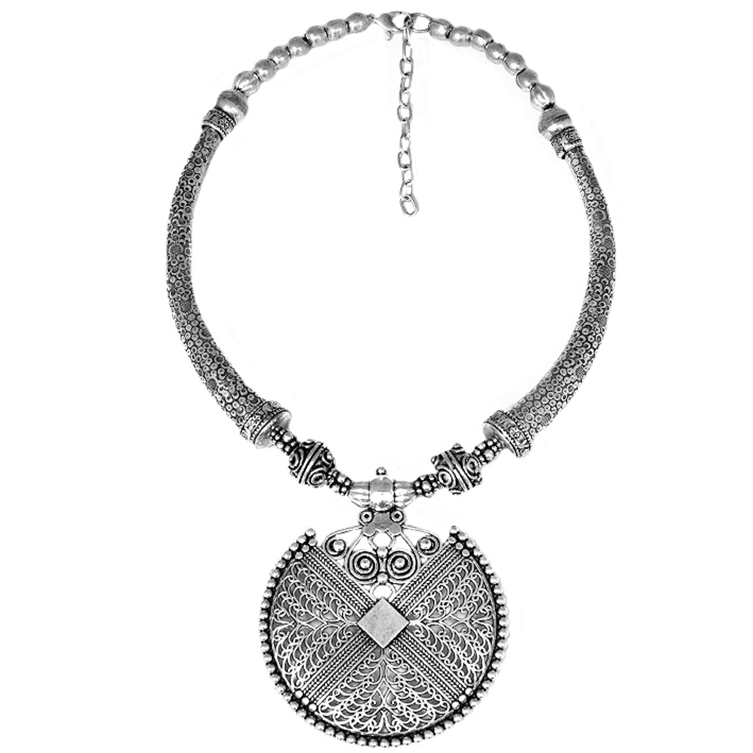 Collier ras de cou fantaisie en métal argenté vieilli.