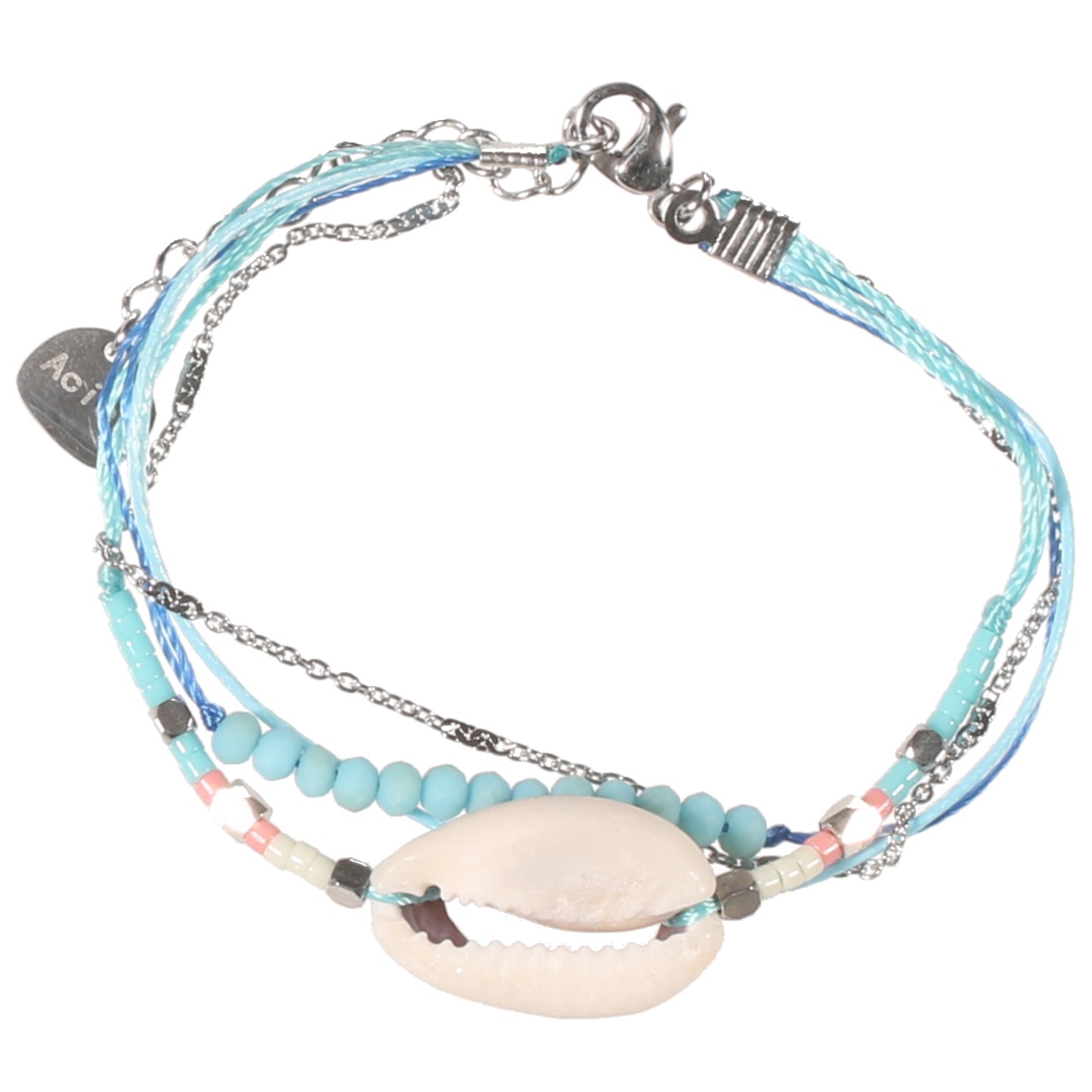 Bracelet en acier, pierres synthétiques, coquillage et textile.