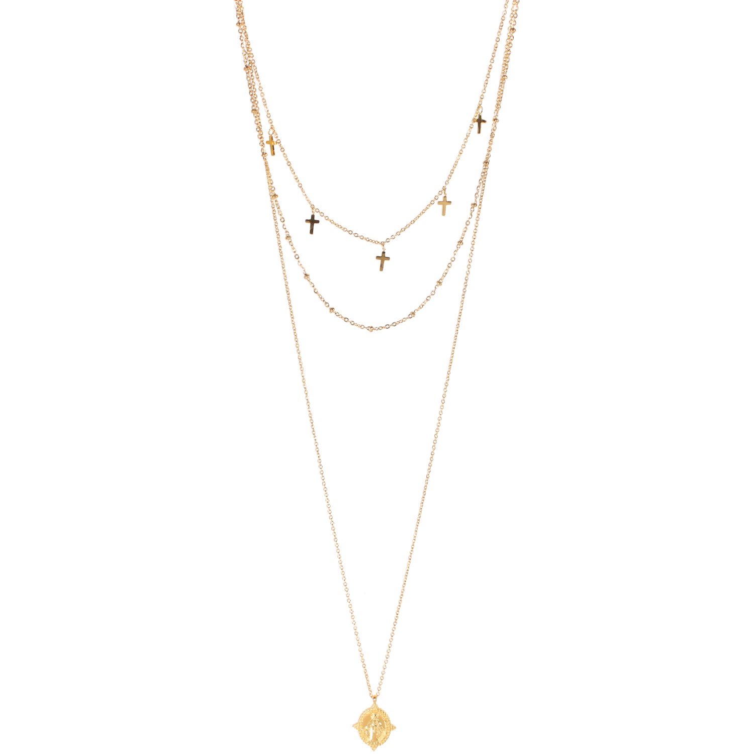 Collier sautoir triple rangs composé d'un collier de 38 cm de long avec petites croix en acier doré, un collier de 42 cm de long en acier doré ainsi qu'un collier de 68 cm de long avec pendentif de la Vierge en acier doré.