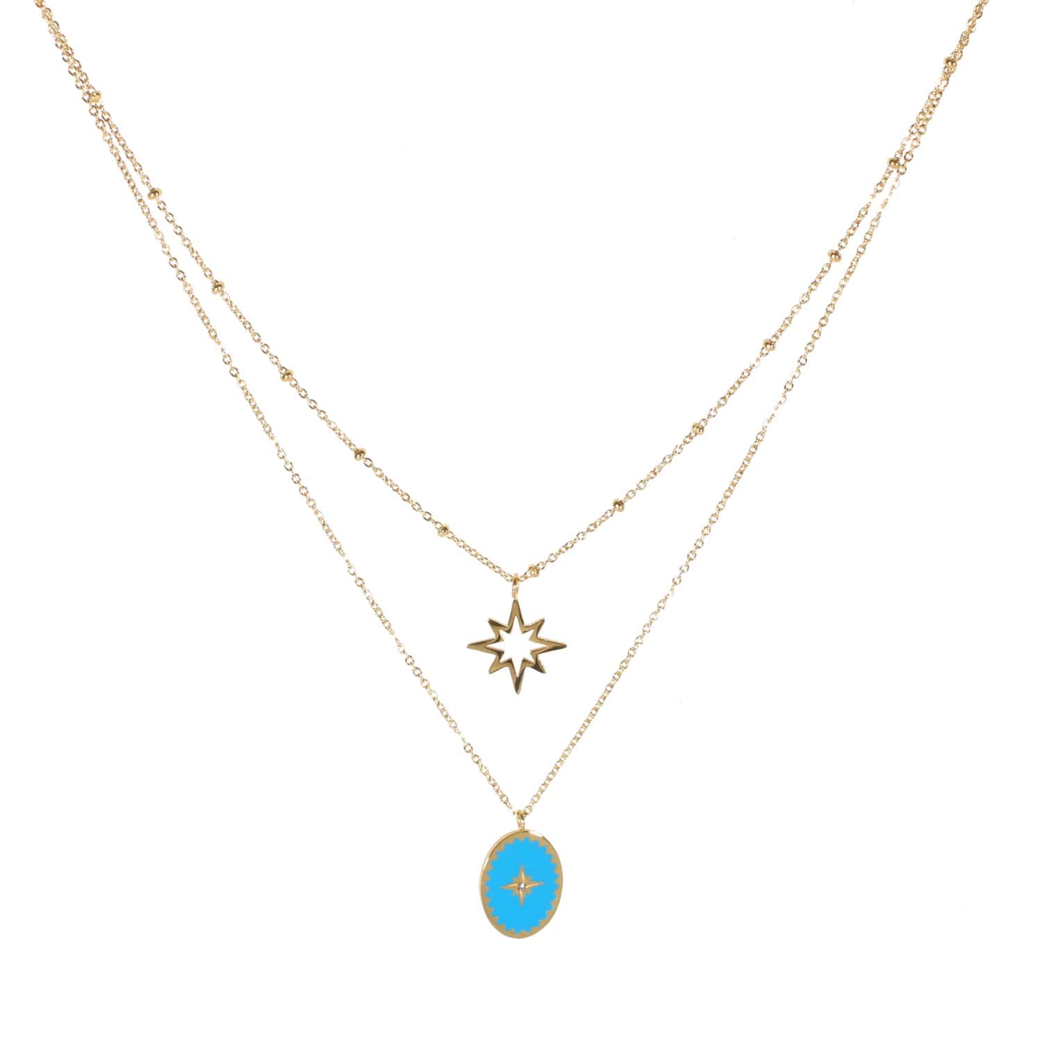Collier double rangs composé d'un collier de 38 cm de long avec pendentif étoile en acier doré ainsi qu'un collier de 42 cm de long avec pendentif ovale en acier doré, un cristal et émail de couleur turquoise.