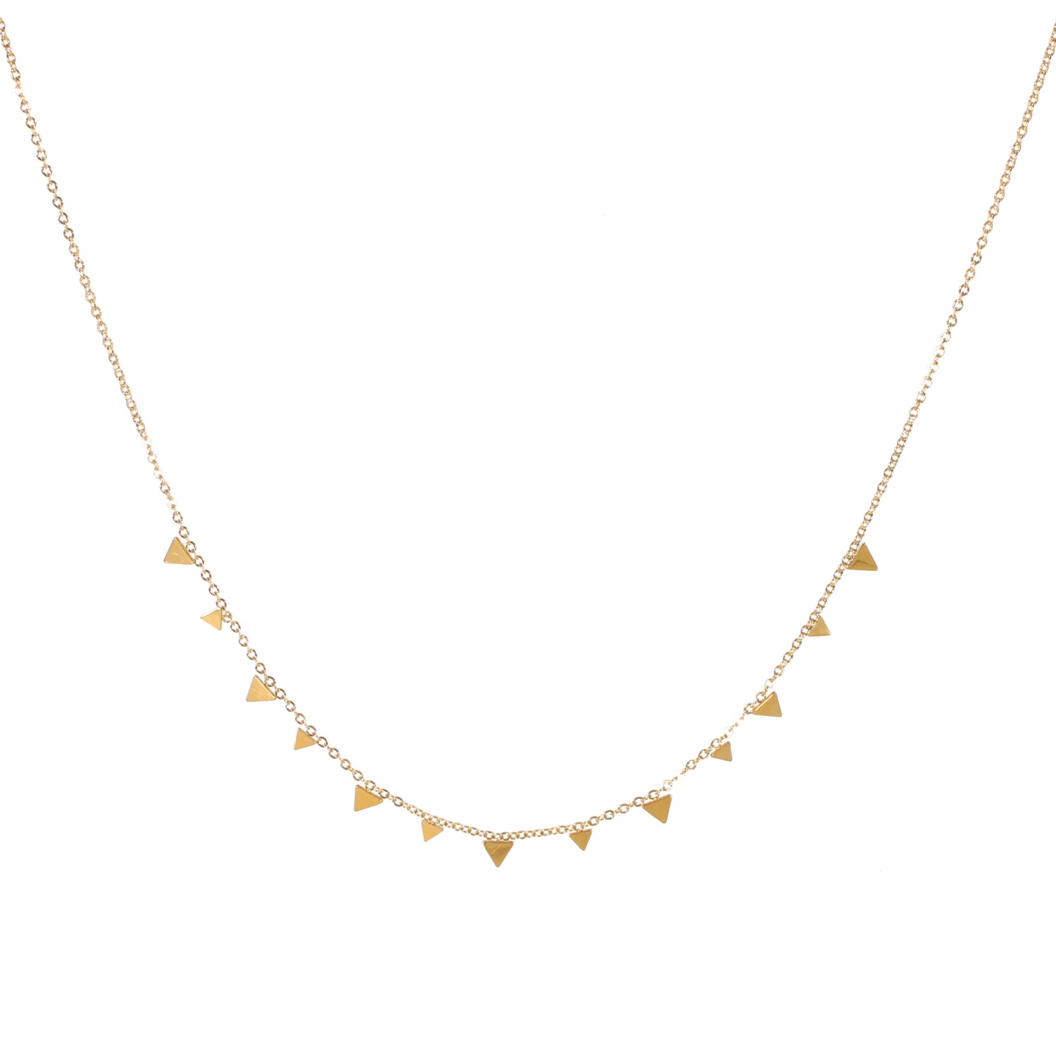 Description Collier avec pampilles triangulaires en acier doré. Fermoir mousqueton avec 5 cm de rallonge. Cliquez sur une matière, un thème, une couleur ou une collection pour voir tous les articles associés.