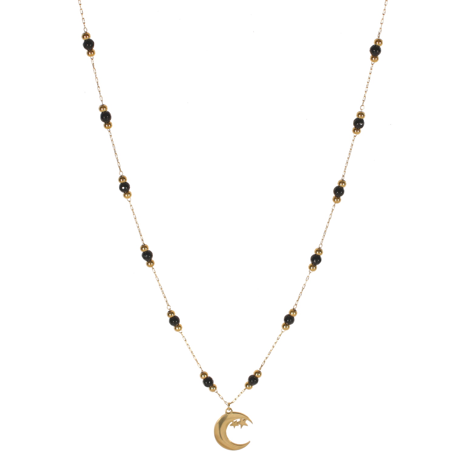 Collier composé d'une chaîne avec pendentif croissant de lune avec étoiles en acier doré et des perles en pierre véritable.