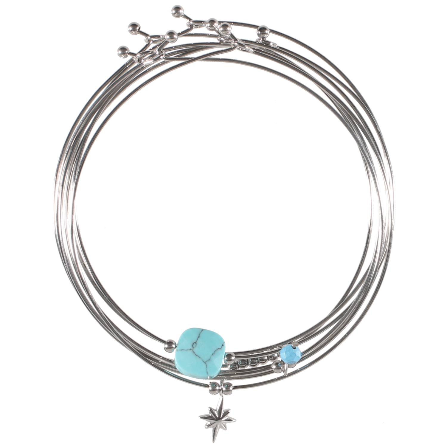 Description Ensemble de 7 bracelets jonc fil rond et fin avec perles et étoile en acier argenté et pierres d'imitation turquoise. Cliquez sur une matière, un thème, une couleur ou une collection pour voir tous les articles associés.