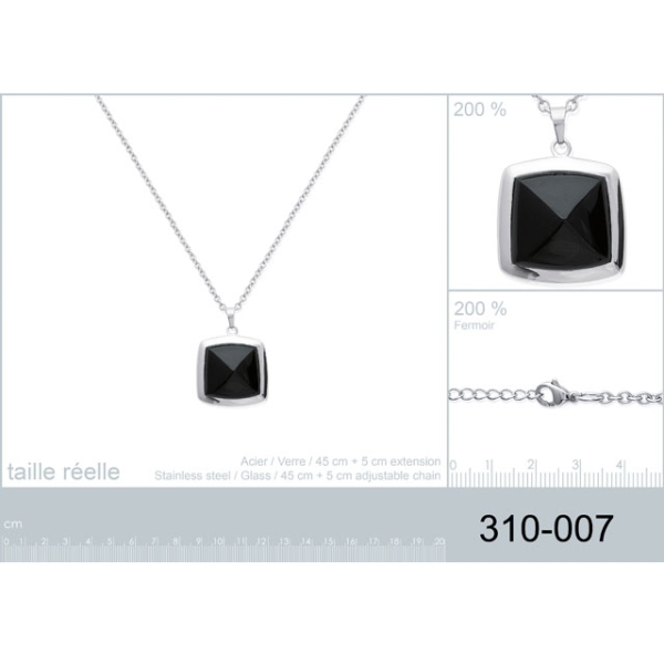 Description Collier en acier et verre. Longueur 45 cm [Guide des tailles] Matière(s) Acier , Verre . L'acier utilisé dans la bijouterie existe sous plusieurs qualités. Nous utilisons principalement la qualité 316L, qualité qui est utilisée en chirurgie. Cet acier est donc inoxydable et reste très résistant. Fermoir Mousqueton À noter Pendant 28x28 mm Couleur(s) dominante(s) Argenté , Multicolore , Noir Public Adulte . Genre Femme . Saison Indémodable . Cliquez sur une matière, un thème, une couleur ou une collection pour voir tous les articles associés.