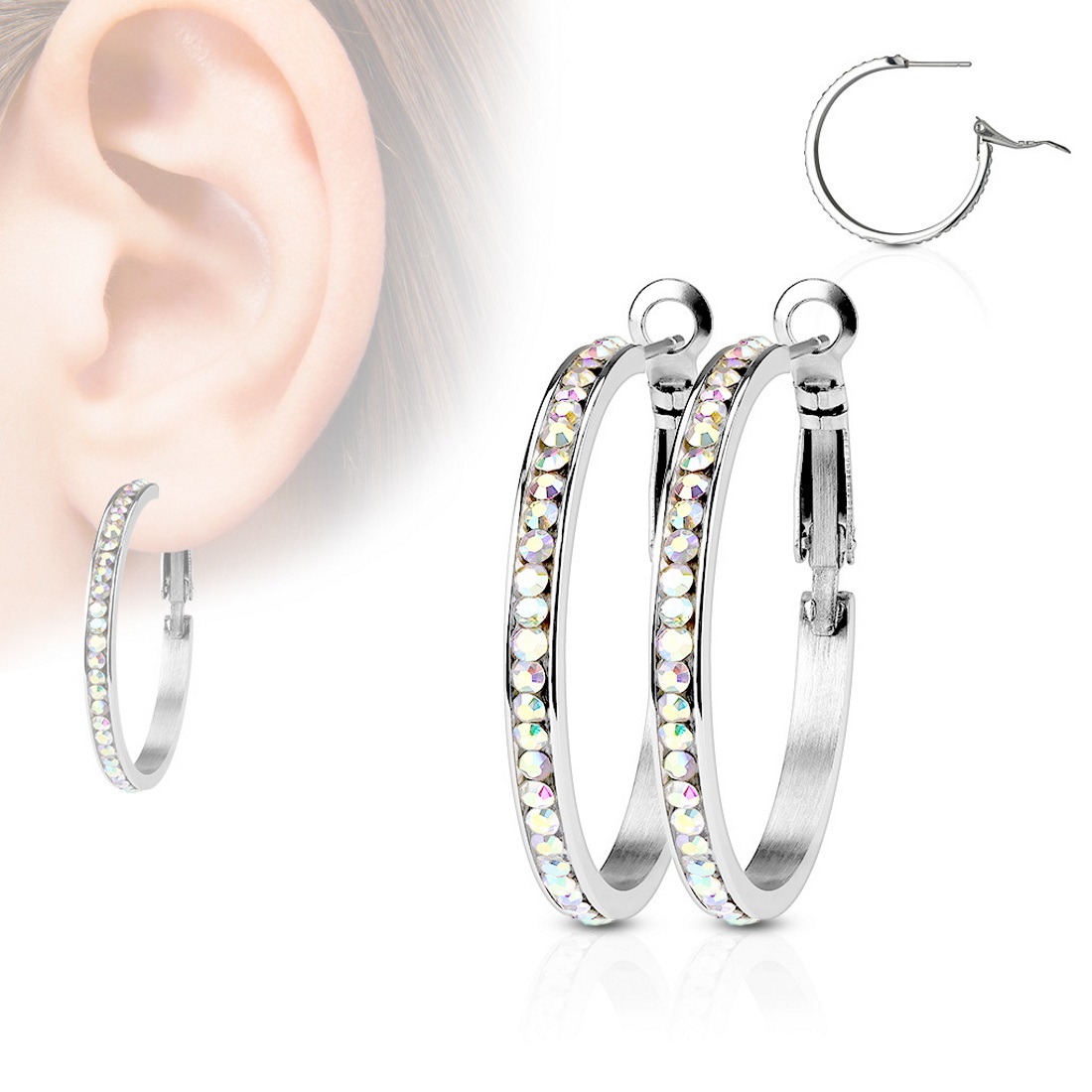 Boucles d'oreilles créoles en acier chirurgical 316L et cristaux synthétiques de couleur aurore boréale.