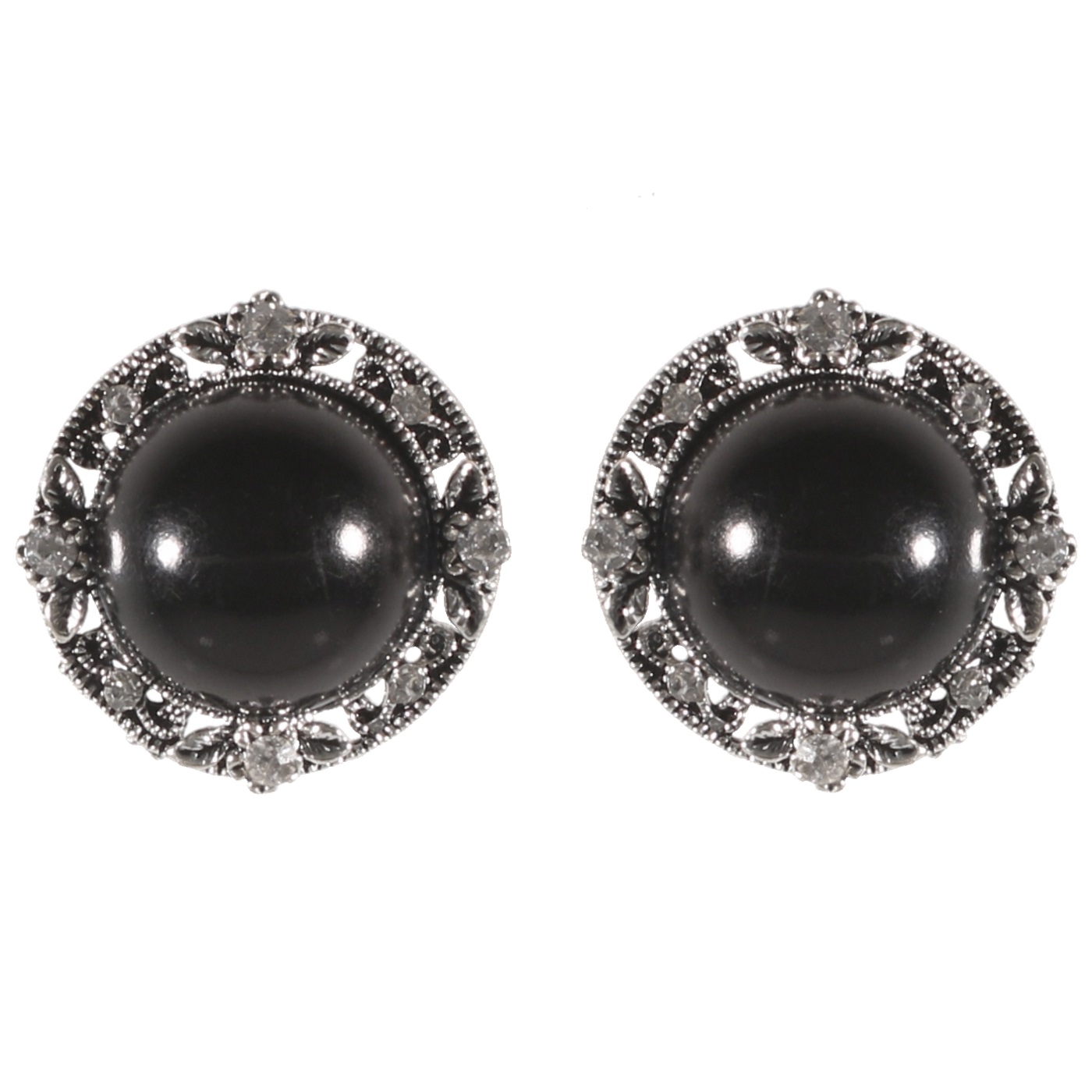 Boucles d'oreilles fantaisie en métal argenté, strass couleur cristal et perles synthétiques.
