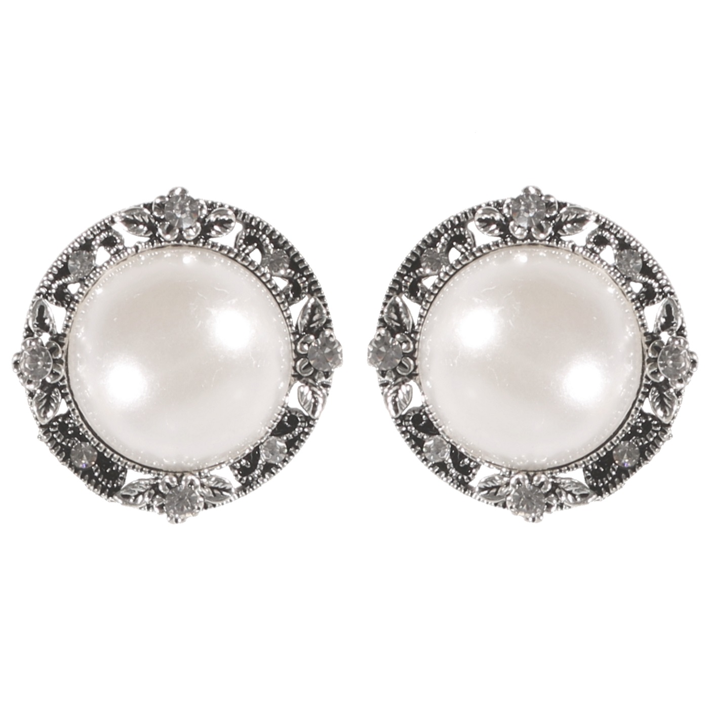 Boucles d'oreilles fantaisie en métal argenté, strass couleur cristal et perles synthétiques.