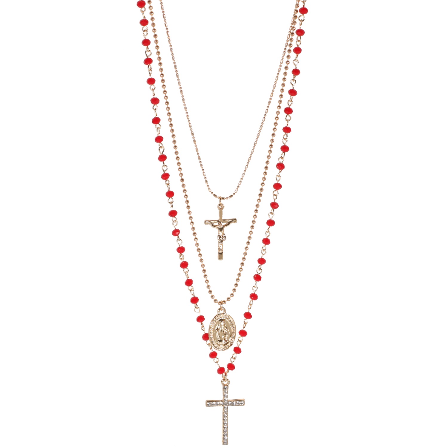 Collier sautoir fantaisie triple rangs avec pendentif croix, vierge et croix avec strass en métal doré et perles de couleur.