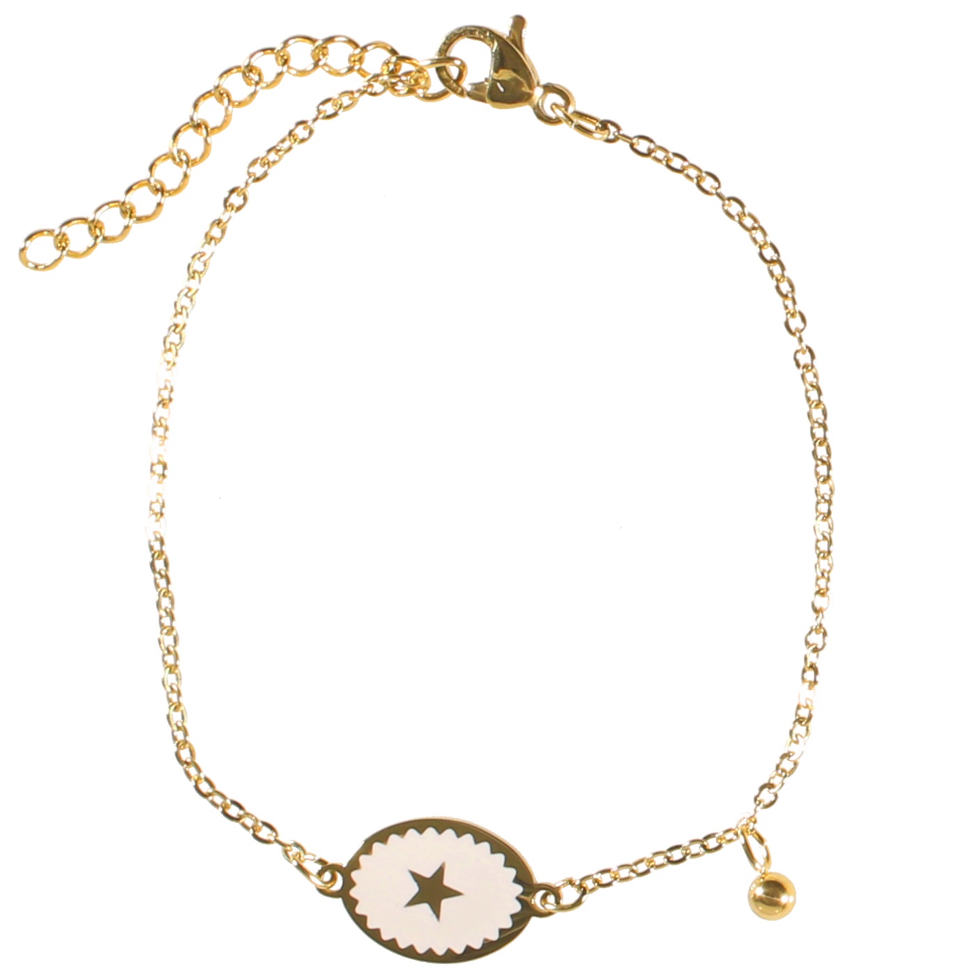 Description Bracelet avec pastille motif étoile et pampille en acier doré et émail. Cliquez sur une matière, un thème, une couleur ou une collection pour voir tous les articles associés.