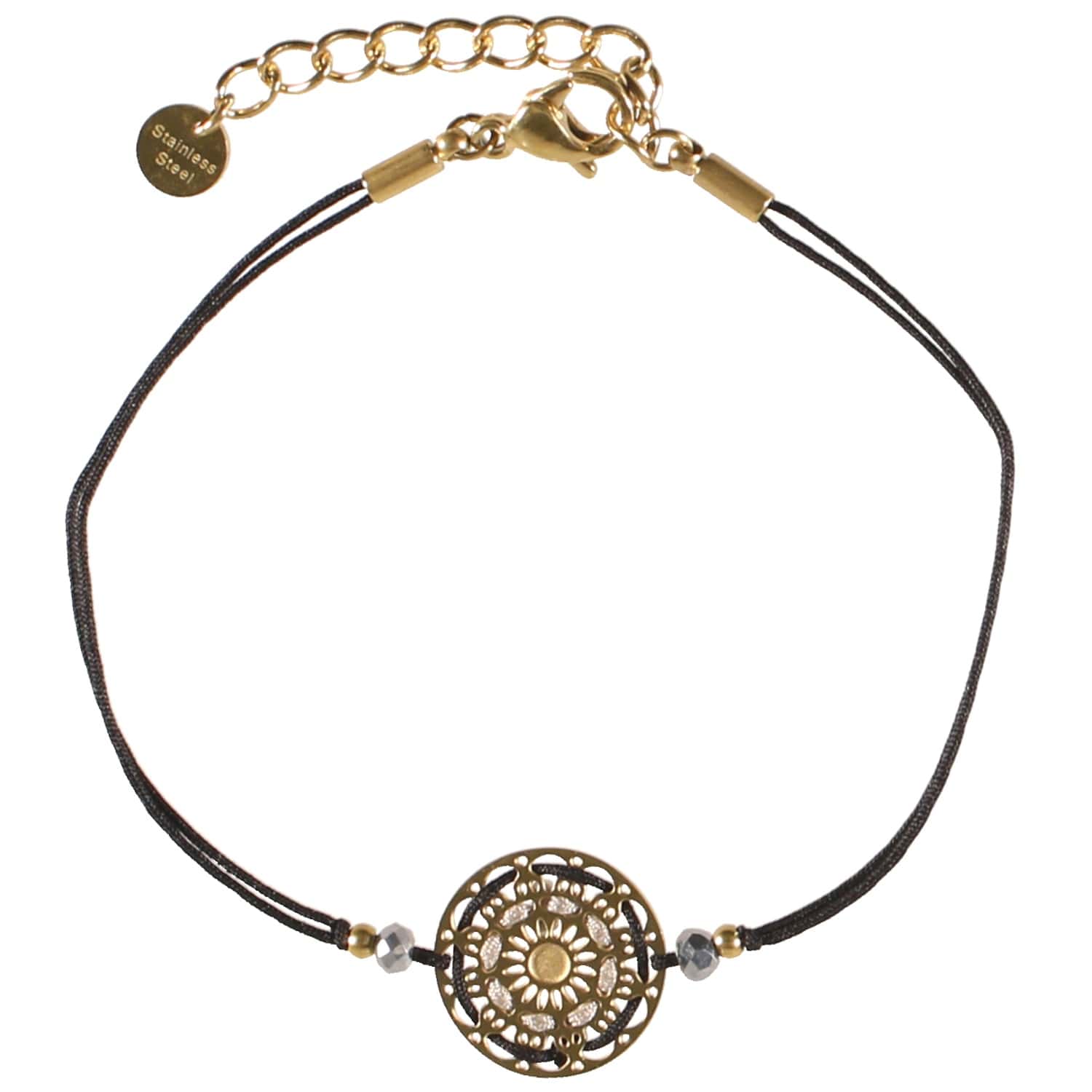 Bracelet avec cordon en coton, perles de couleur et pastille ajourée en acier doré.