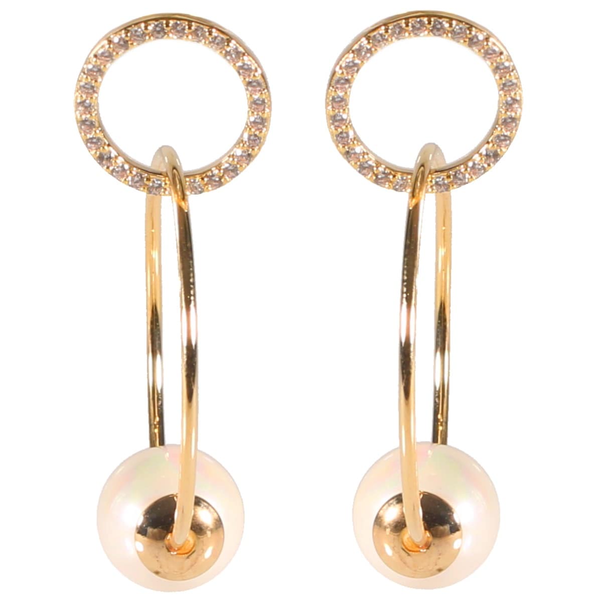 Boucles d'oreilles fantaisie pendantes en métal doré, cercle de strass en oxydes de zirconium et perles synthétiques montées sur cercle en métal doré.
