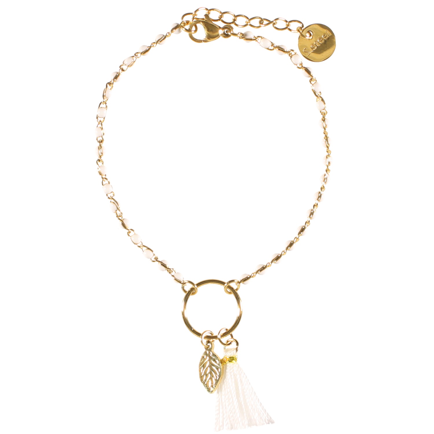 Bracelet avec cercle et feuille pendante en acier doré, perles en émail et pompon en textile.